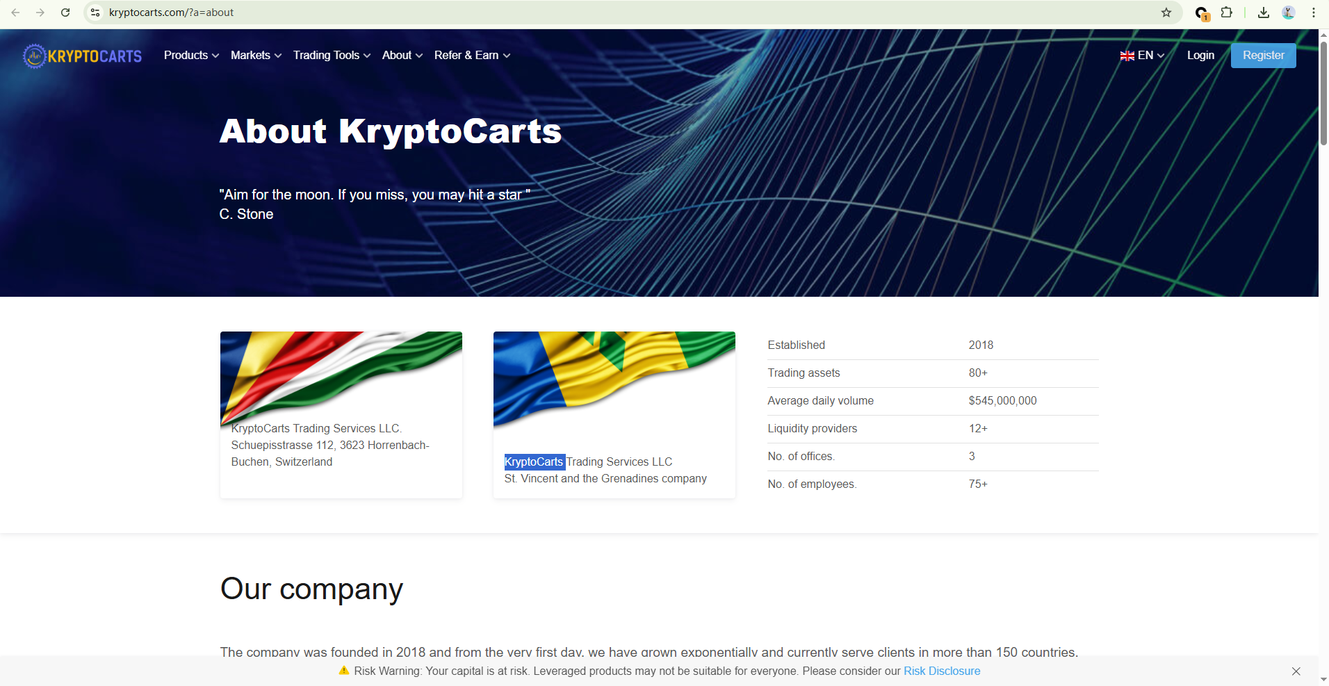 KryptoCarts claims to have company registrations in Saint Vincent and the Grenadines and Switzerland. It does not disclose any valid regulatory licenses or oversight from recognized financial authorities.