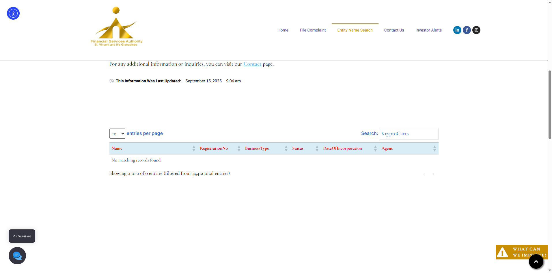 Upon investigation, we first examined the registry of the Financial Services Authority (FSA) of Saint Vincent and the Grenadines. No record was found of a company named KryptoCarts Trading Services LLC being registered or authorized to provide financial services.
