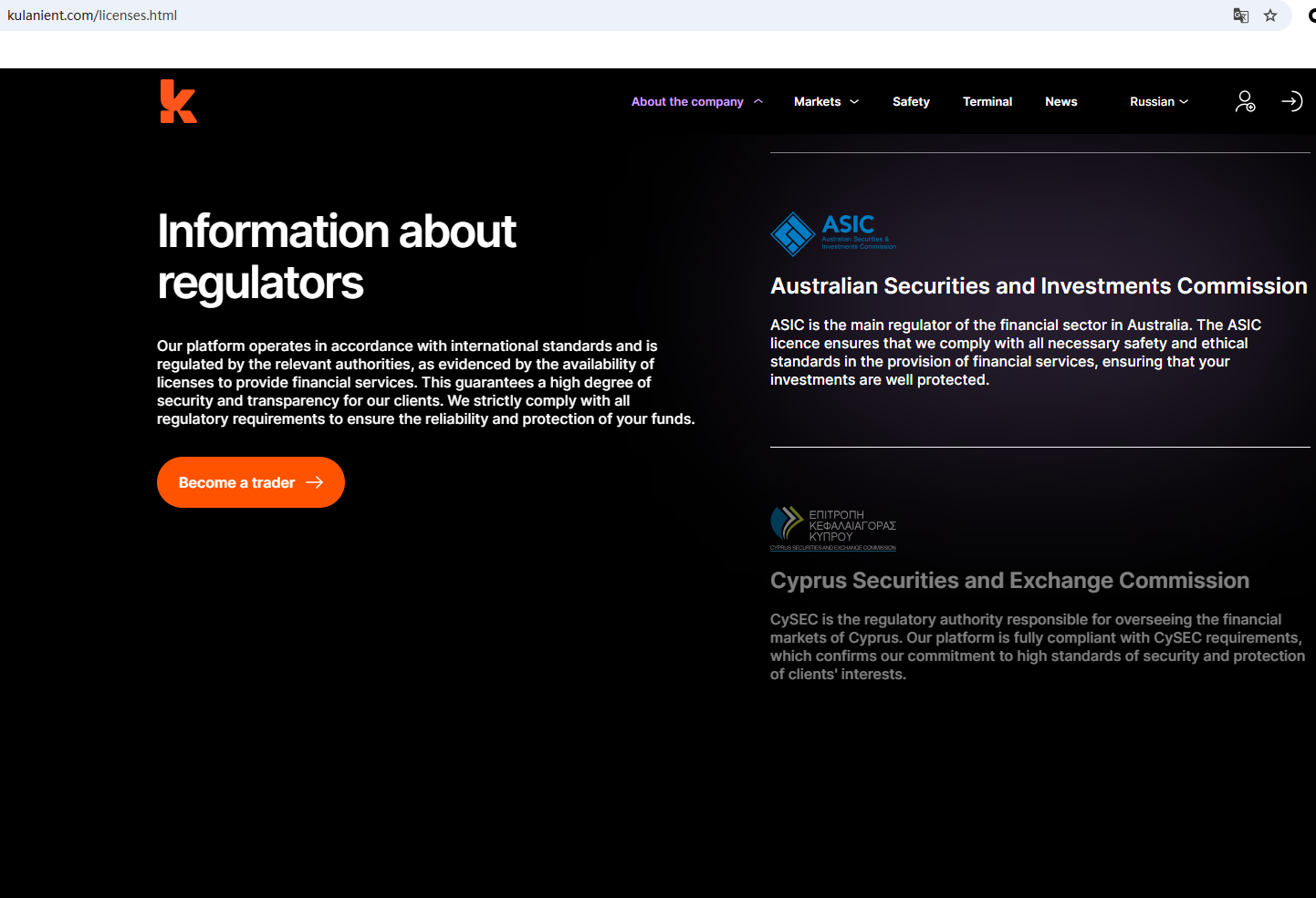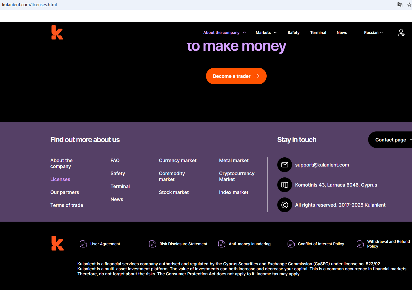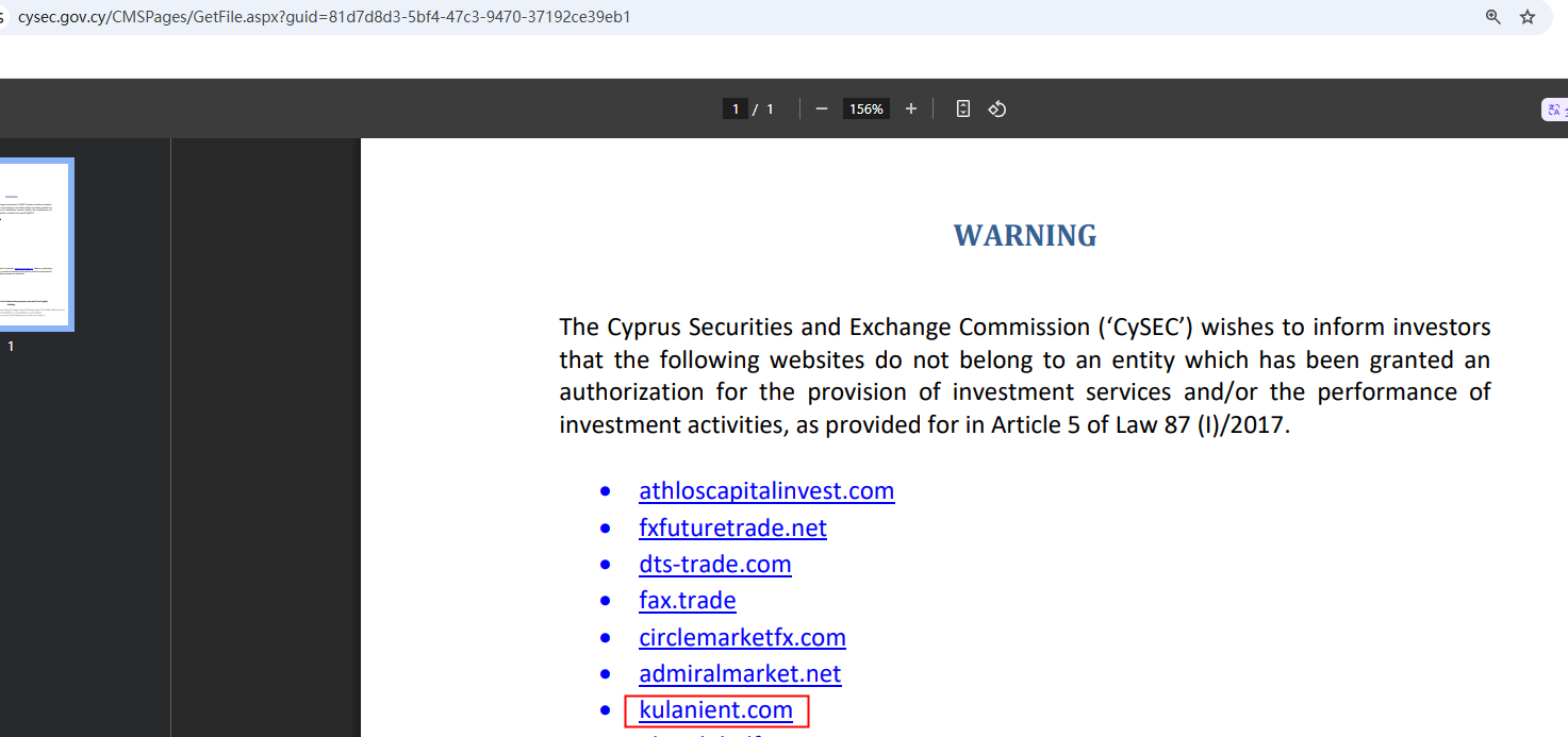 On May 19, 2025, the Cyprus Securities and Exchange Commission (CySEC) issued a warning against kulanient, believing this company might be providing financial services or products without authorisation. You may visit: https://www.cysec.gov.cy/CMSPages/GetFile.aspx?guid=81d7d8d3-5bf4-47c3-9470-37192ce39eb1