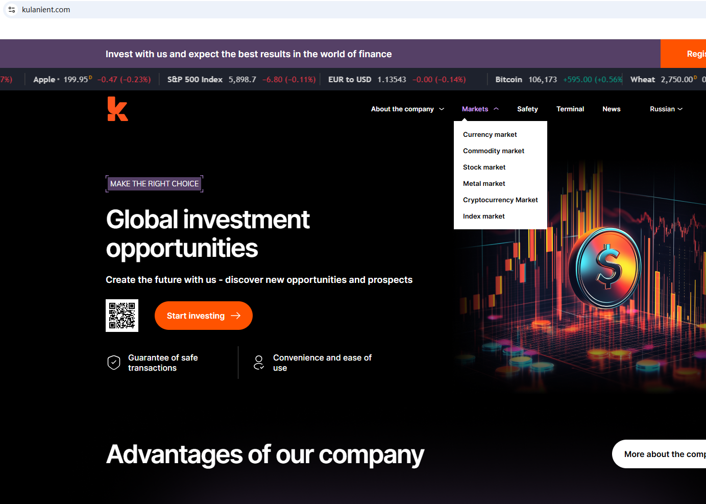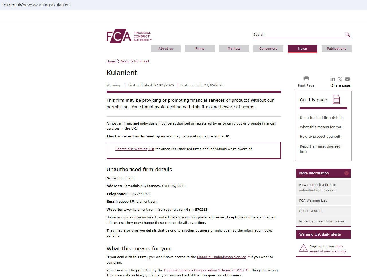 On May 21, 2025, the Financial Conduct Authority (FCA) issued a warning against kulanient, believing this company might be providing financial services or products without proper authorization in the UK. https://www.fca.org.uk/news/warnings/kulanient