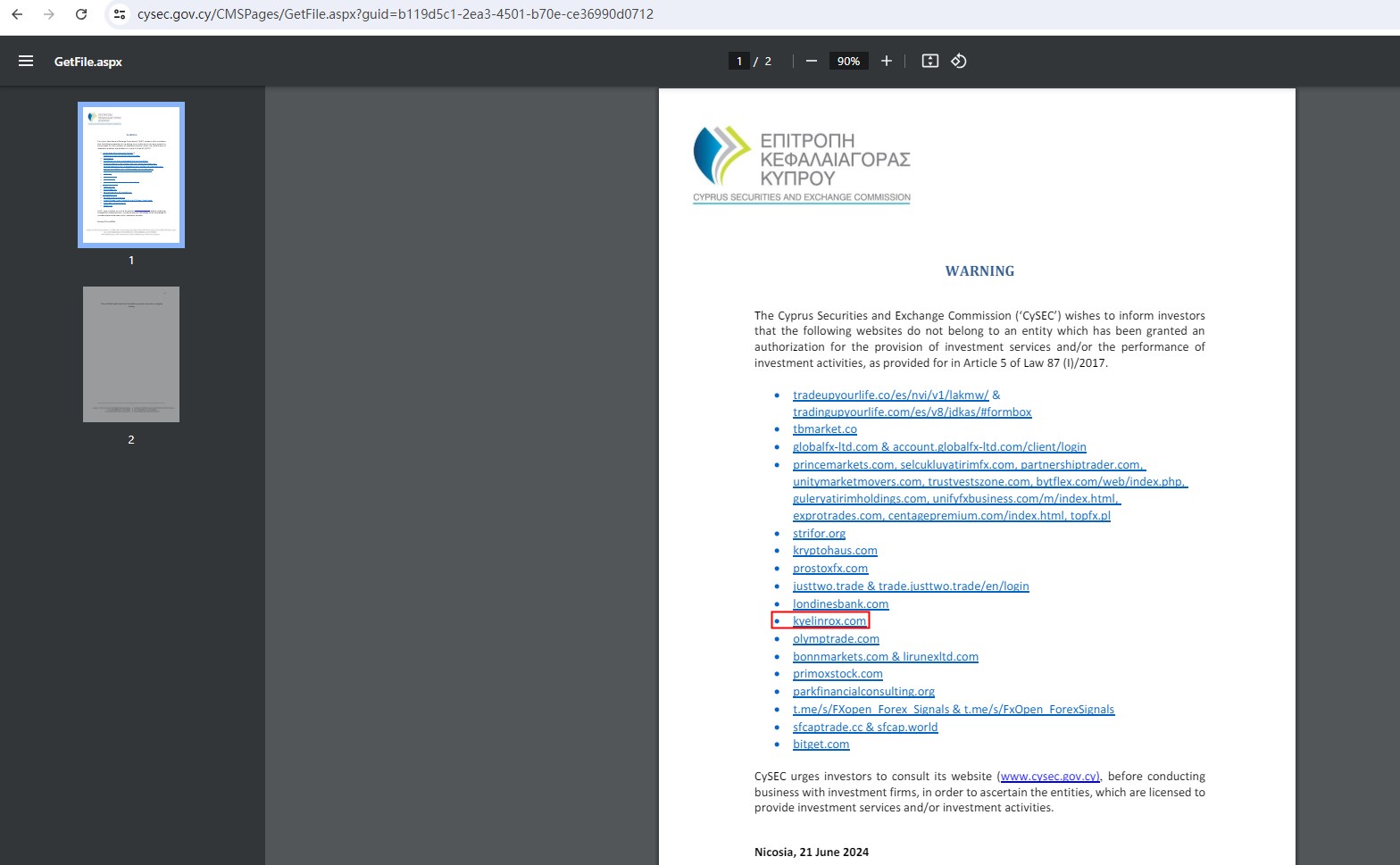 On 19 February 2024, the Cyprus Securities and Exchange Commission (FCA) issued a warning against Kyelin Rox, believing this company might be providing financial services or products without authorisation. You may visit: https://www.cysec.gov.cy/CMSPages/GetFile.aspx?guid=b119d5c1-2ea3-4501-b70e-ce36990d0712.