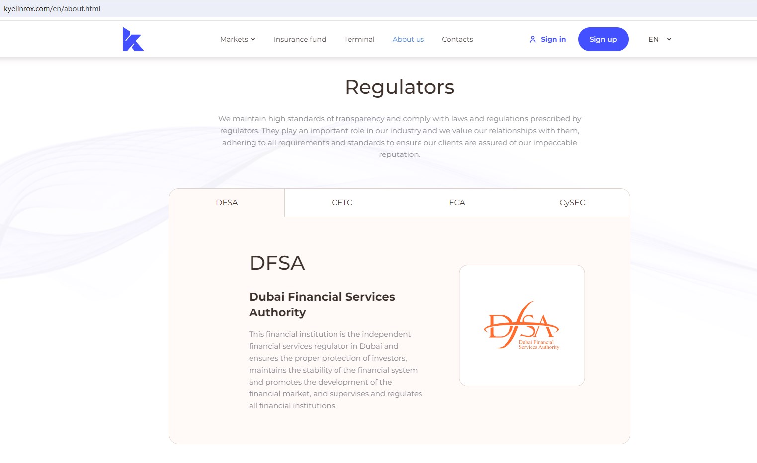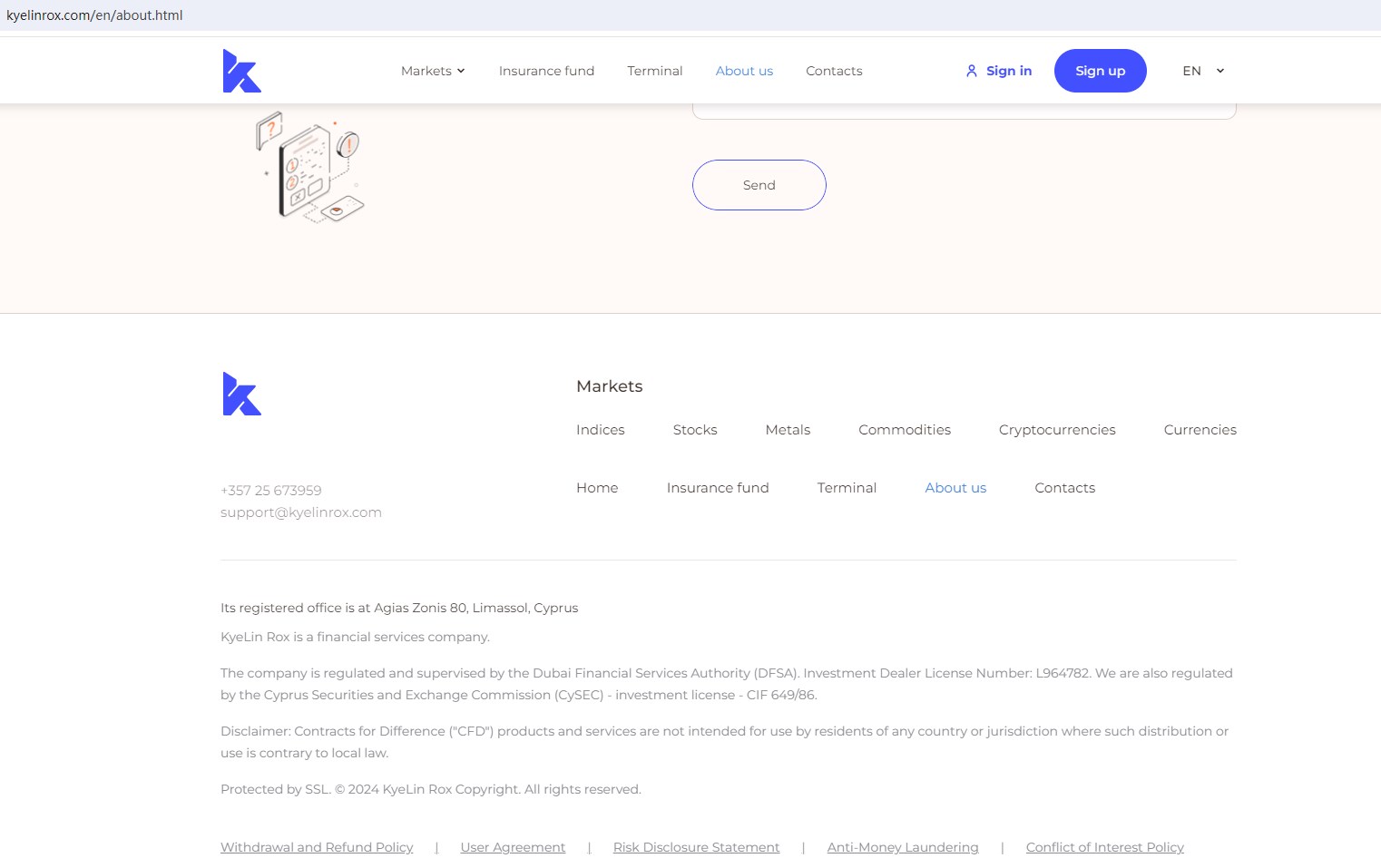 Kyelin Rox claims to be a financial services company regulated by the DuBai Financial Services Authority(DFSA), the U.S. Commodity Futures Trading Commission(CFTC) and the United Kingdom Financial Conduct Authority(FCA), together with offices in Cyprus and regulated by the Cyprus Securities and Exchange Commission(CySEC), Investment License Number 649/86, offering wide range of financial services, including Indices, Stocks, Metals, Commodities, Cryptocurrencies, Currencies and more instruments in global markets.
