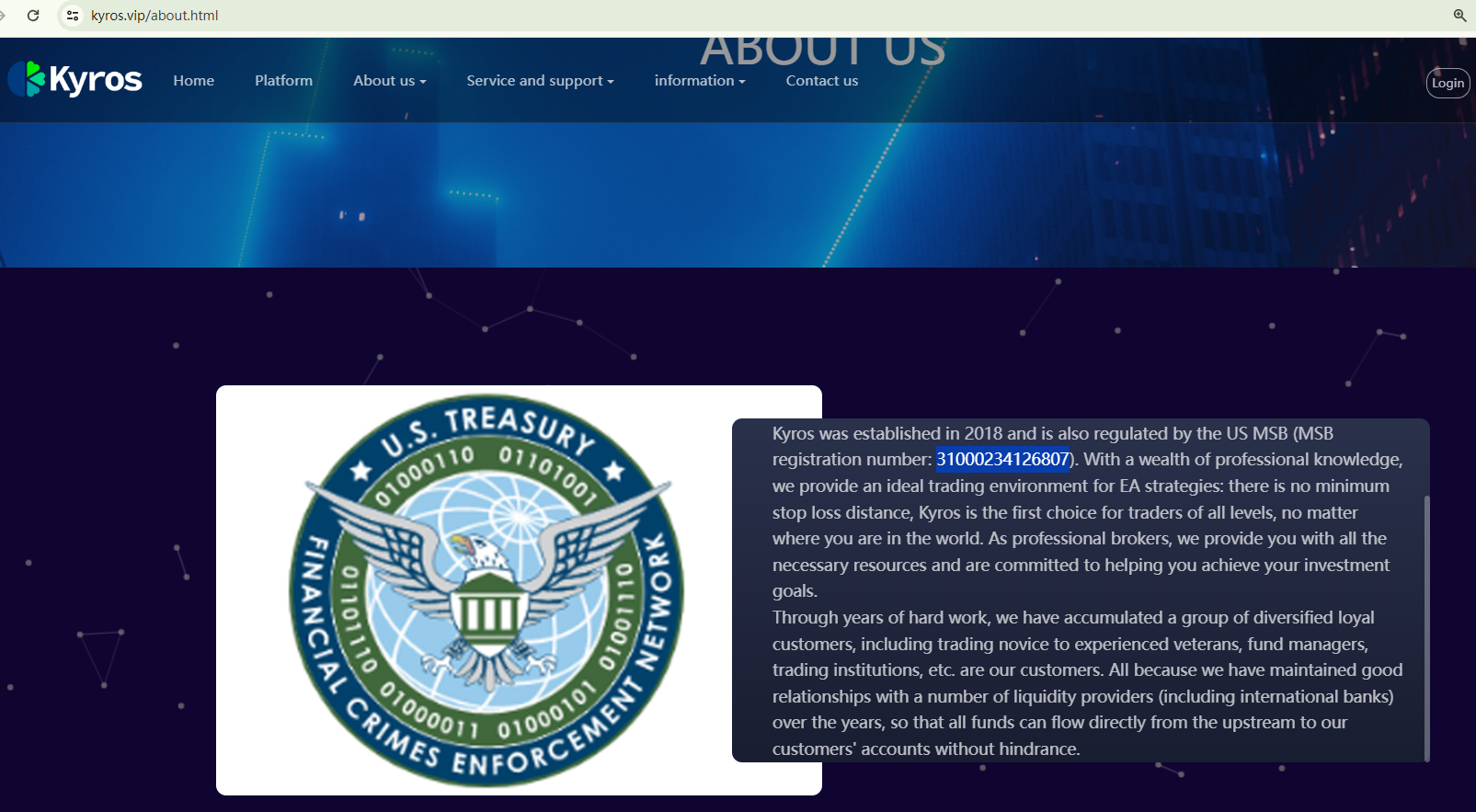 Regarding its MSB registration, the number 31000234126807 on the FinCEN register is associated with a company named SSJTCF GROUP LIMITED, not Kyros GROUP LIMITED. There is no entity named "Kyros" listed in the register. Furthermore, it's important to note that the FinCEN does not regulate forex trading, and the MSB registration does not equate to endorsement or authorization from the government.
