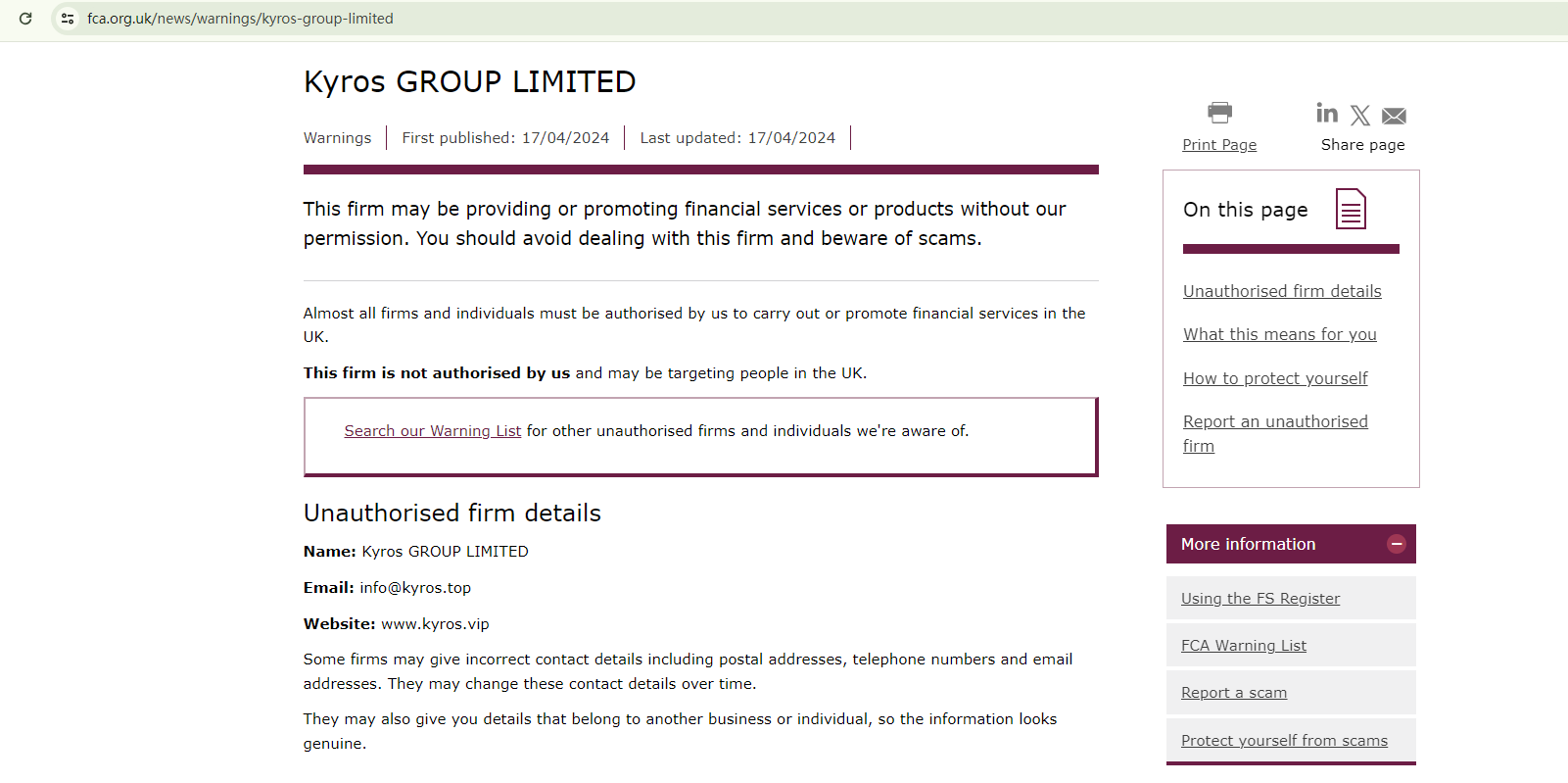 On April 17, 2024, the Financial Conduct Authority (FCA) issued a warning against Kyros GROUP LIMITED, believing this company might be providing financial services or products without proper authorization in the UK. https://www.fca.org.uk/news/warnings/kyros-group-limited