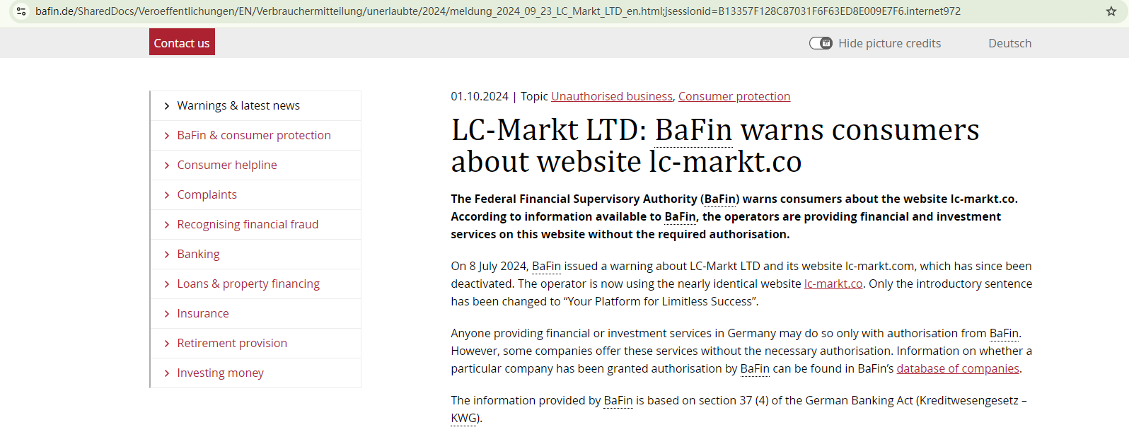 In addition, the Federal Financial Supervisory Authority (BaFin) warned consumers about the website Ic-markt.co, stating that it provides financial and investment services on this website without the required authorization.