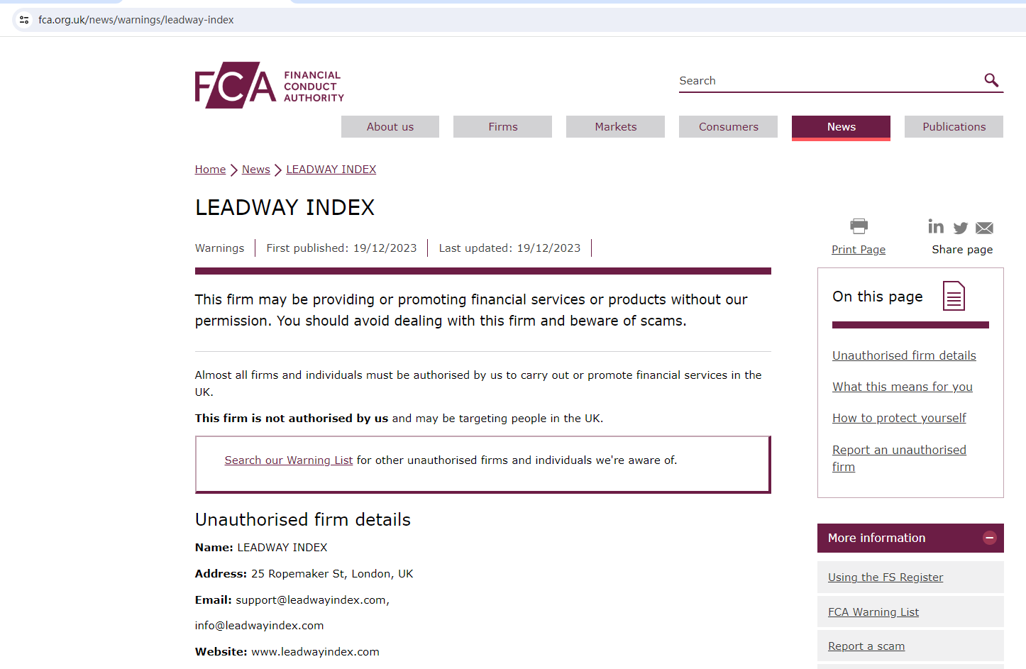 Leadway Index locates in the United Kingdom, but the UK Financial Conduct Authority (UK FCA) issued a warning that Leadway Index was providing finacial services or products without authorisation.