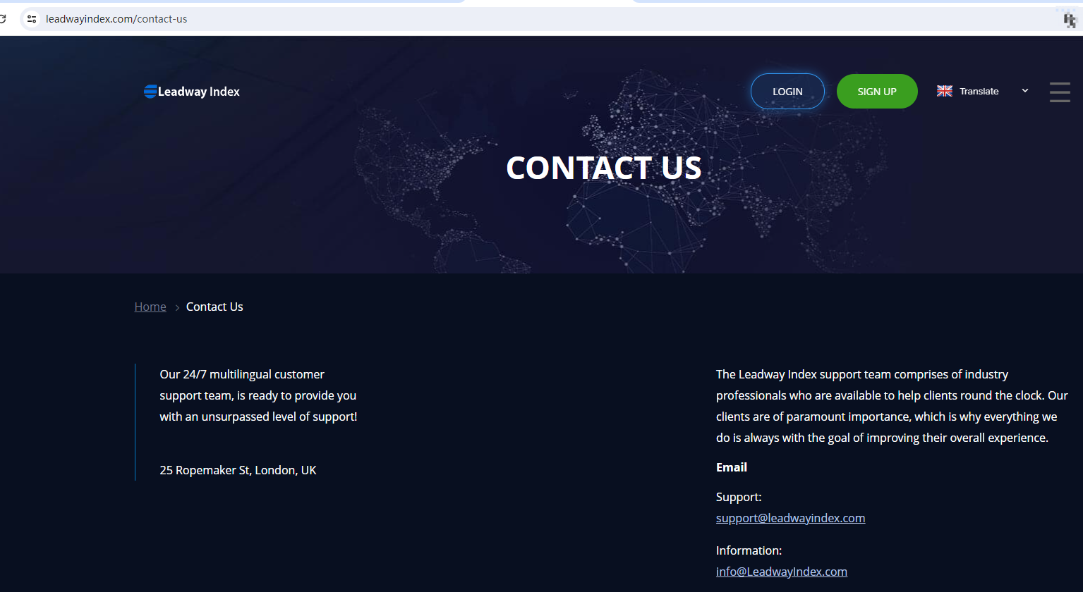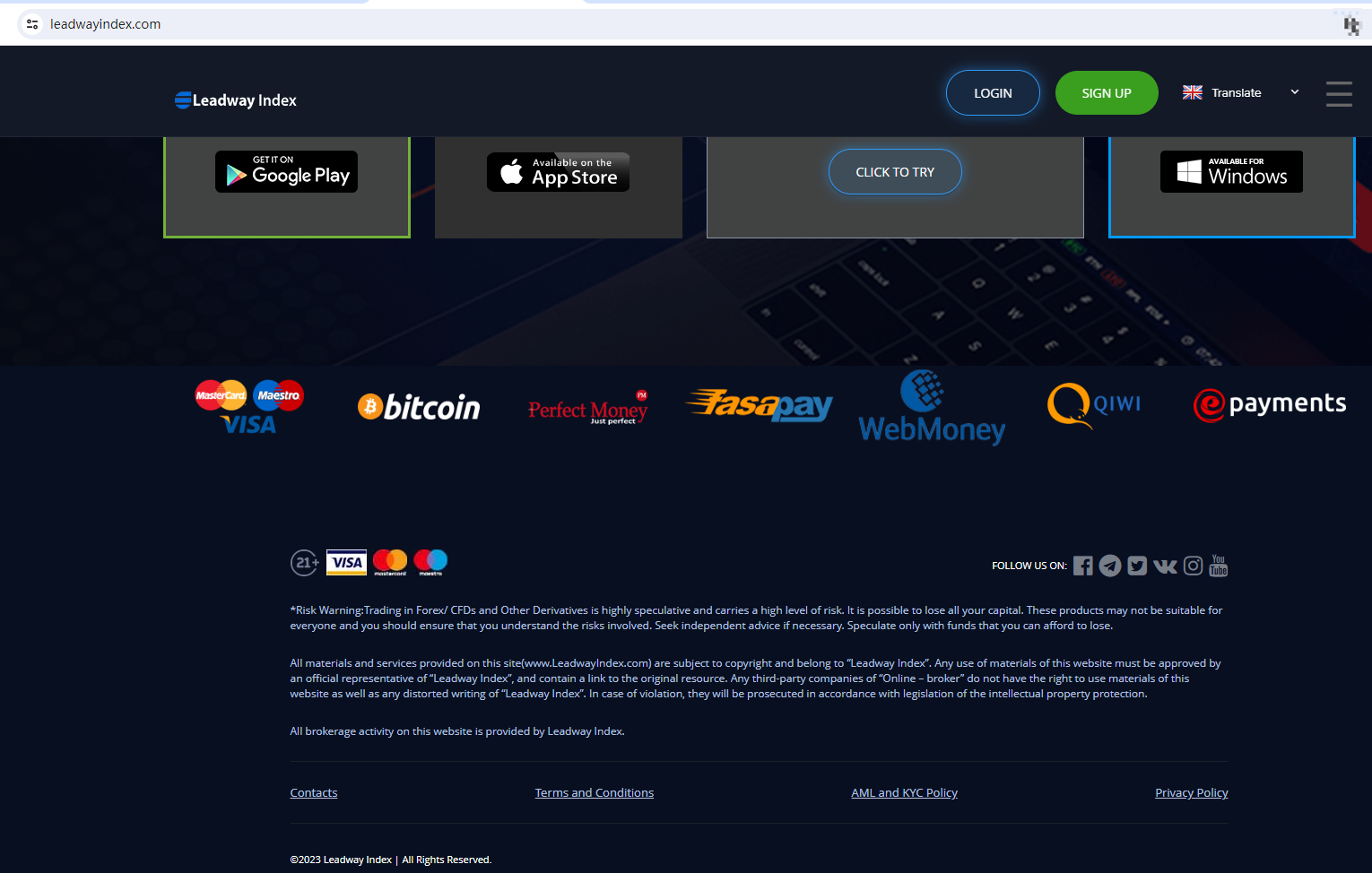 Leadway Index claims to be a reliable company without presenting any information about its regulation. The lack of such important information may be a distinct signal of an unlicensed broker, as regulated companies always present their accreditations and licenses in a prominent position. It is a red flag.