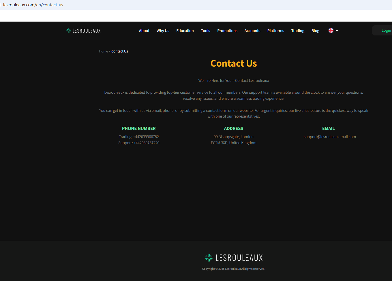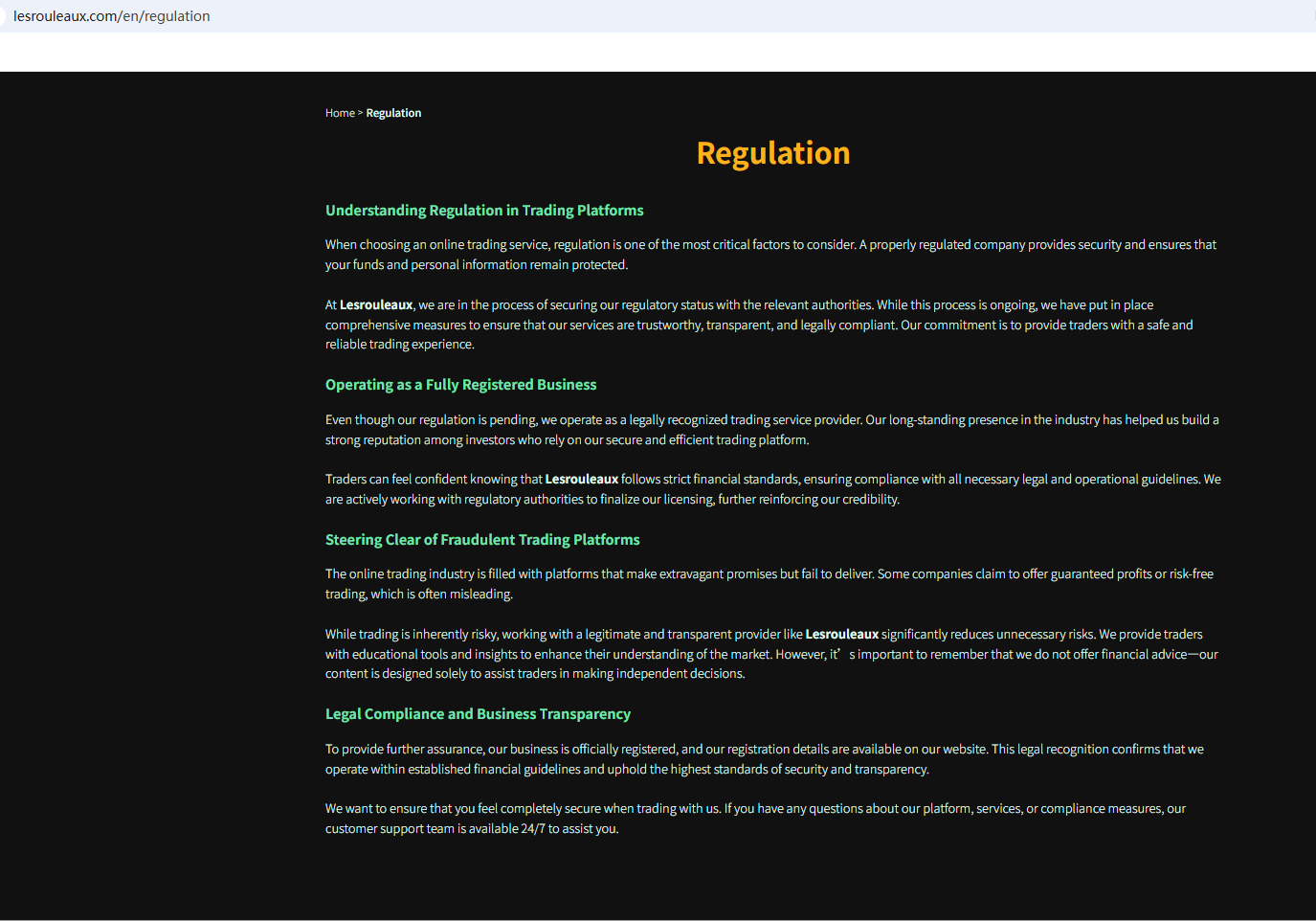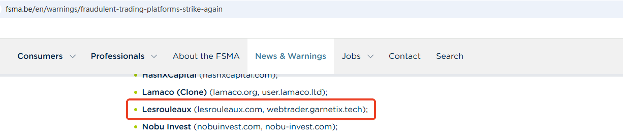 According to its website, it claims to be a reliable company, but it does not display any valid regulatory information on the website. We checked the Financial Conduct Authority (FCA) based on the office address it provided, but did not find any matching information with the FCA. In addition, the Financial Services and Markets Authority (FSMA) issued a warning about Lesrouleaux for the lack of the required authorization.