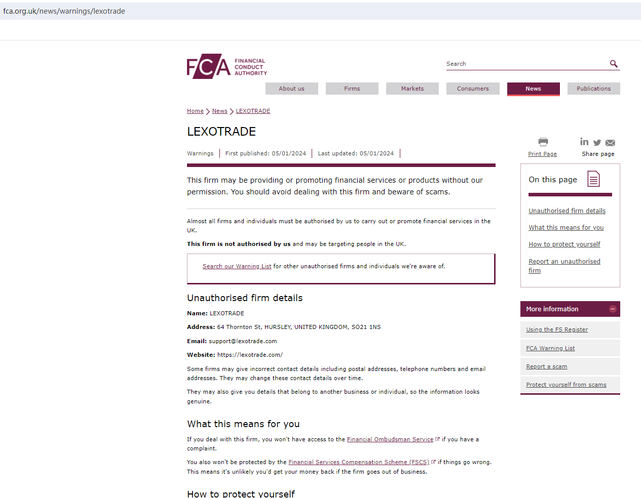 In addition, the United Kingdom Financial Conduct Authority (UK FCA) issued a warning that LEXOTRADE was providing financial services or products in the UK without authorisation.