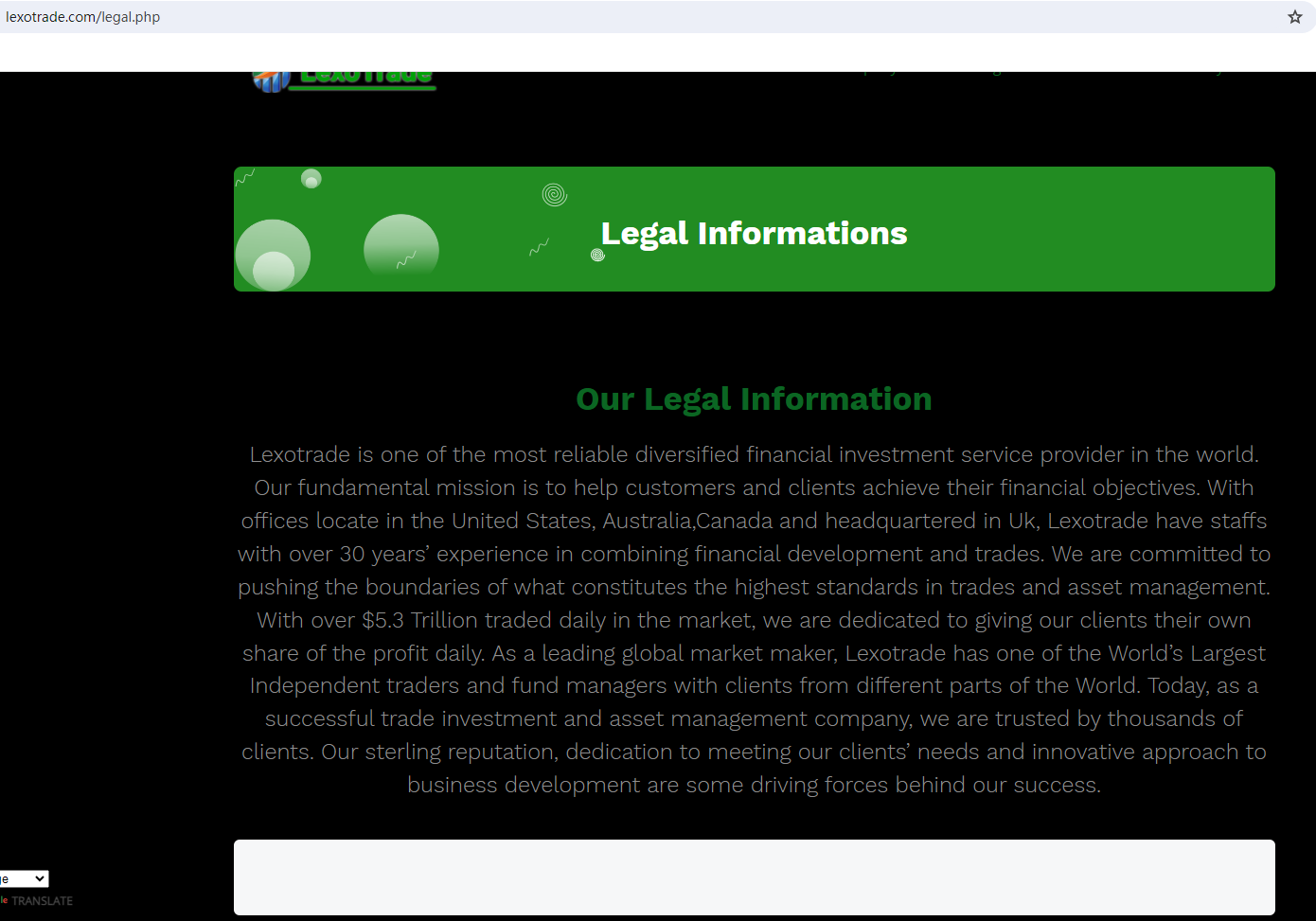 The truth is that LEXOTRADE is not regulated by any regulators. Letting it hold or control investors' money is unsafe, and the money can not be protected by any laws.