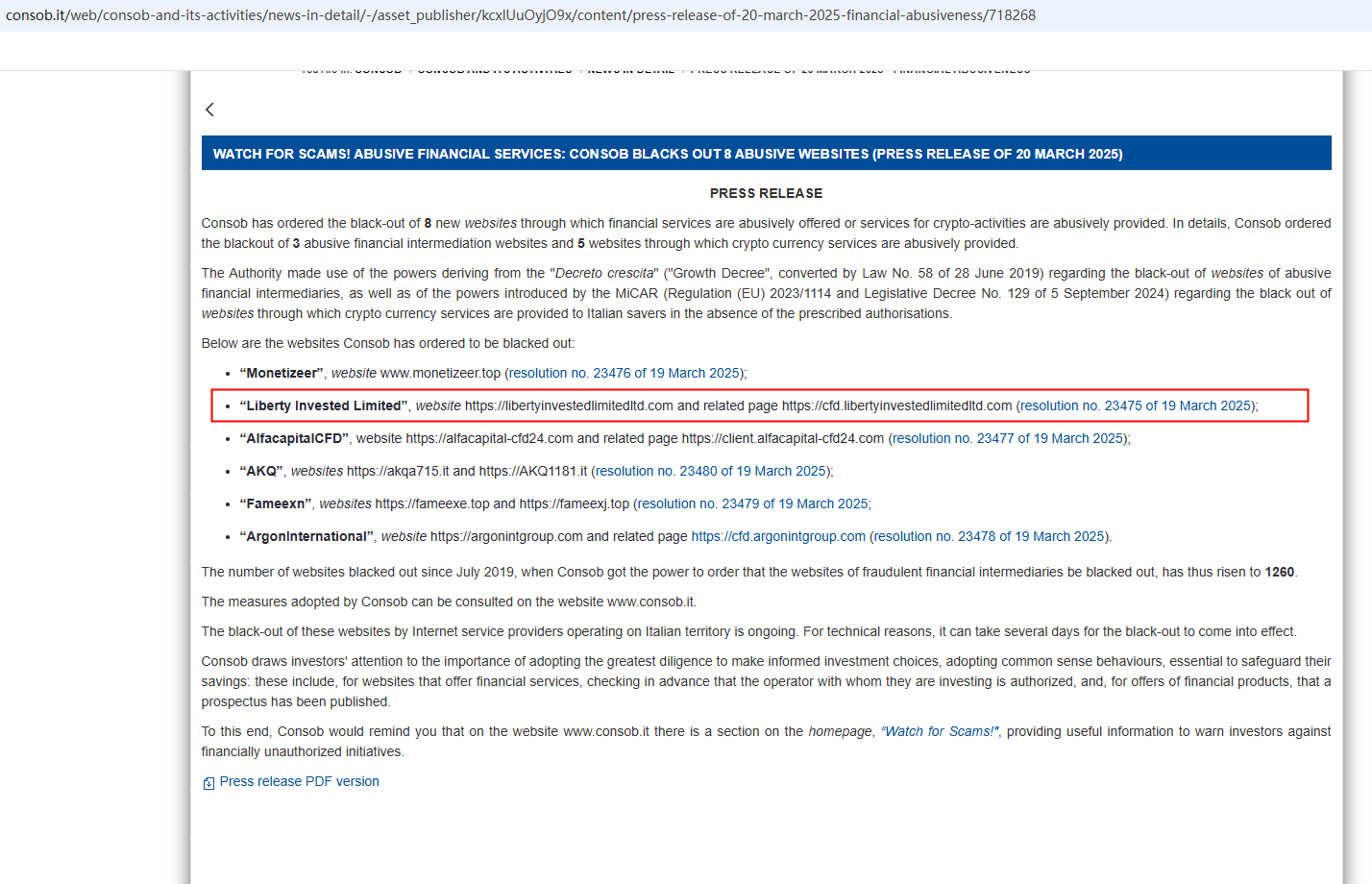 In addition, the Italian Companies and Exchange Commission (CONSOB) ordered Liberty Invested Limited to be blacked out since it offers financial services illegally in Italy.