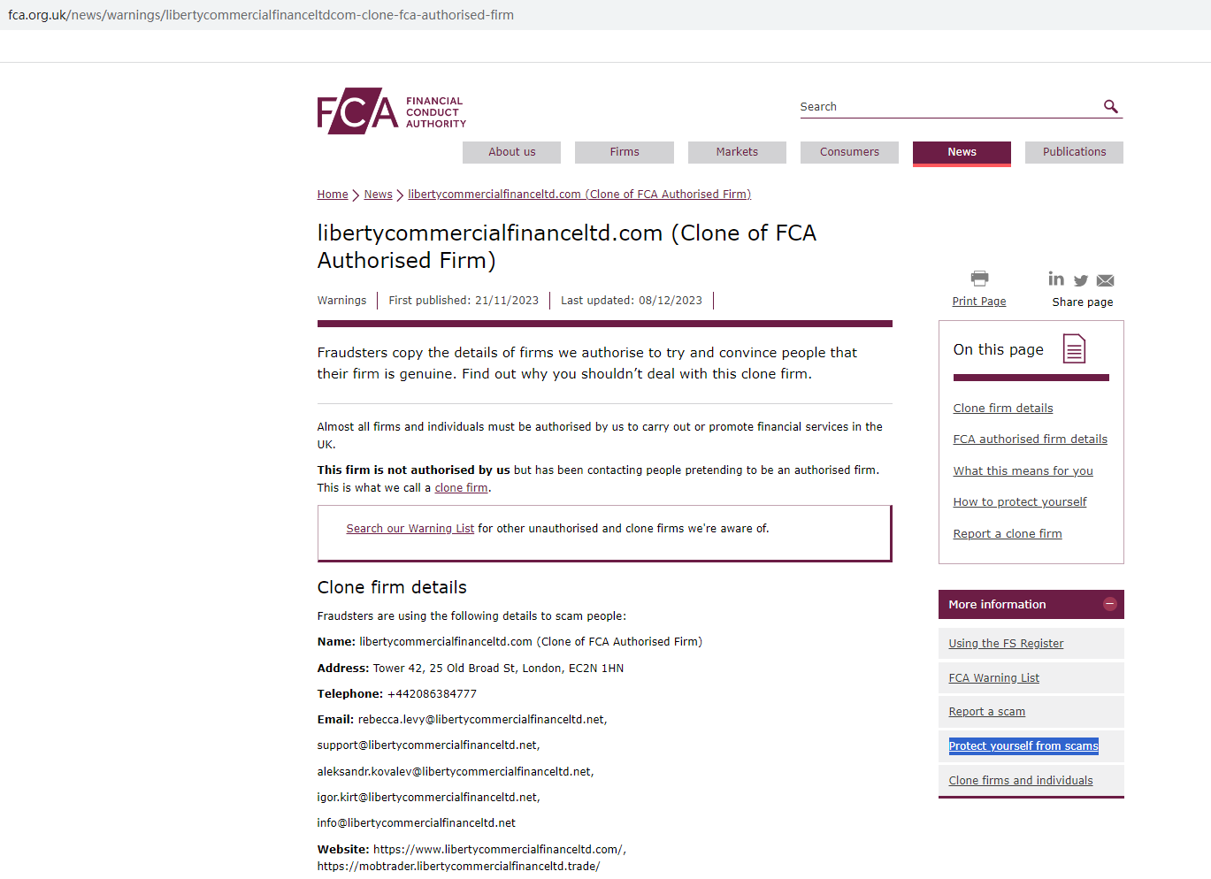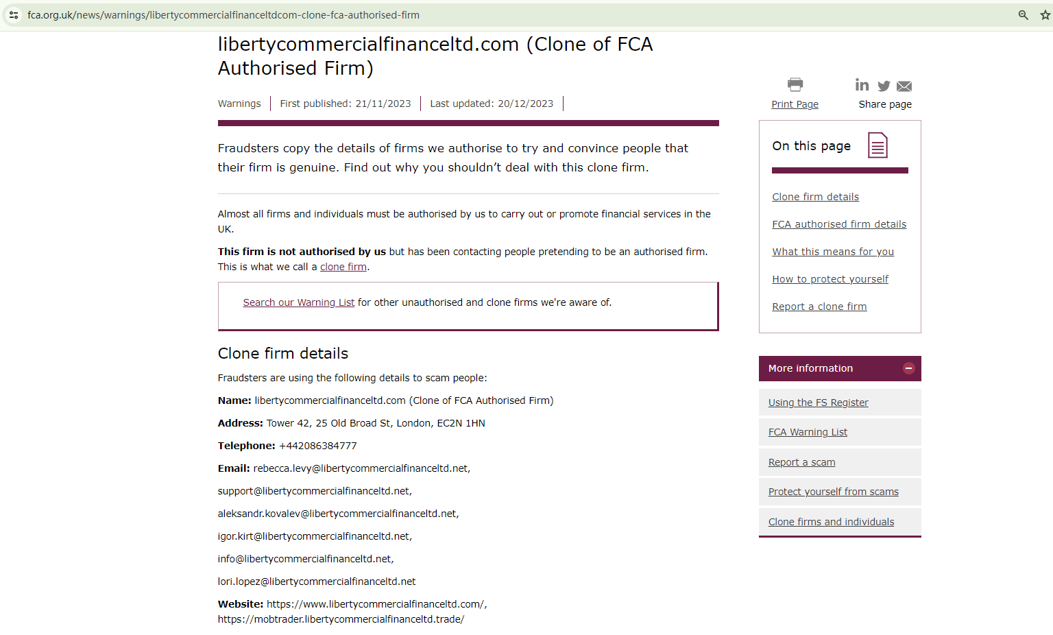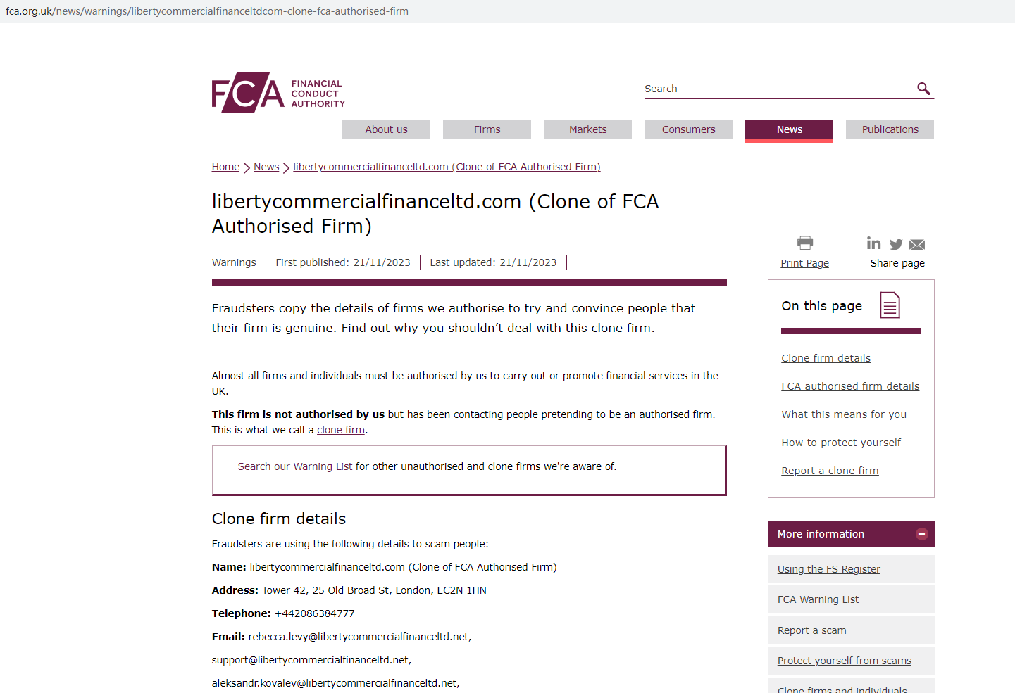 On 21 November 2023, the Financial Conduct Authority (FCA) issued a warning against a clone (libertycommercialfinanceltd.com of Liberty Commercial Finance Limited. https://www.fca.org.uk/news/warnings/libertycommercialfinanceltdcom-clone-fca-authorised-firm