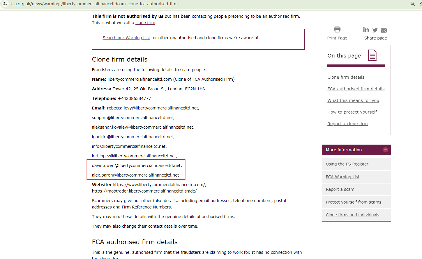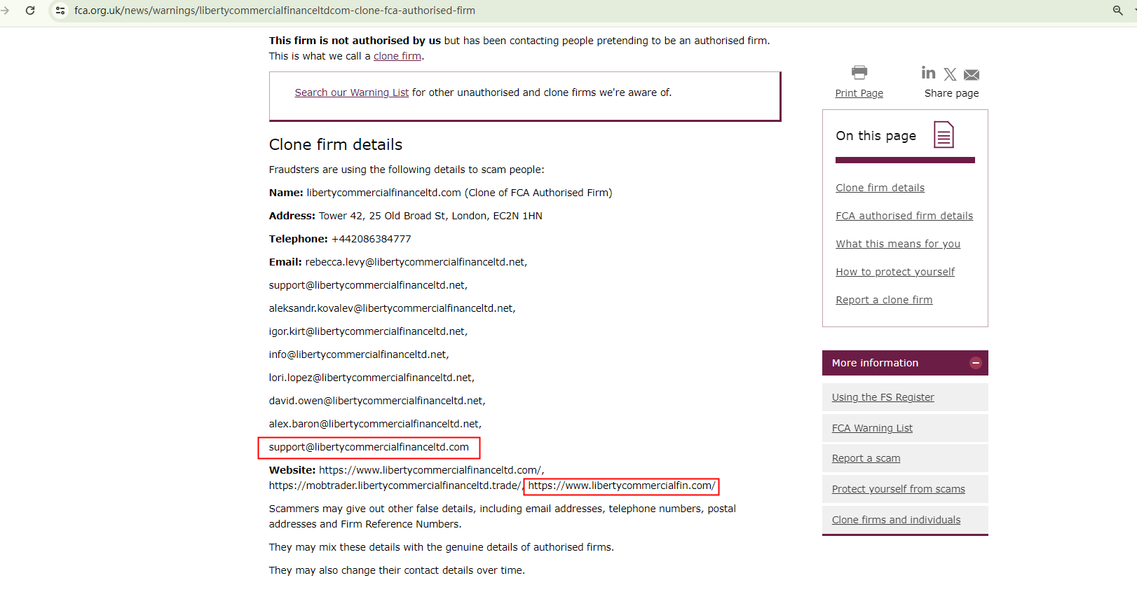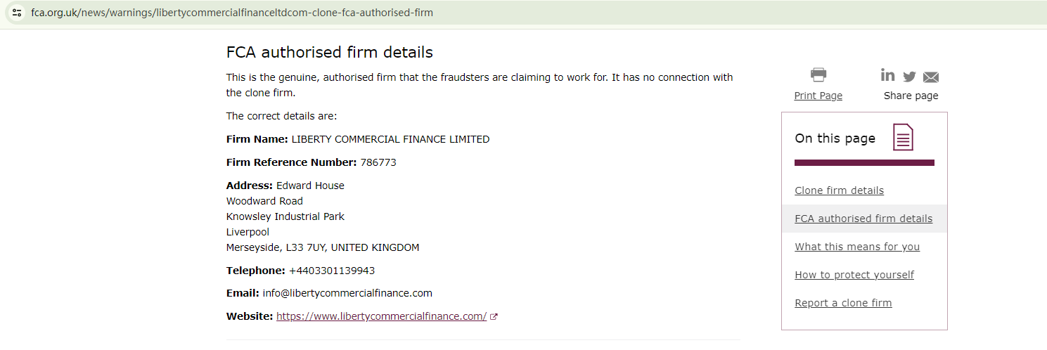 Following the recent discovery of details about this illicit clone firm, the Financial Conduct Authority (FCA) has issued an updated warning against libertycommercialfinanceltd.com. Investors are strongly advised to exercise extreme caution and avoid it. https://www.fca.org.uk/news/warnings/libertycommercialfinanceltdcom-clone-fca-authorised-firm