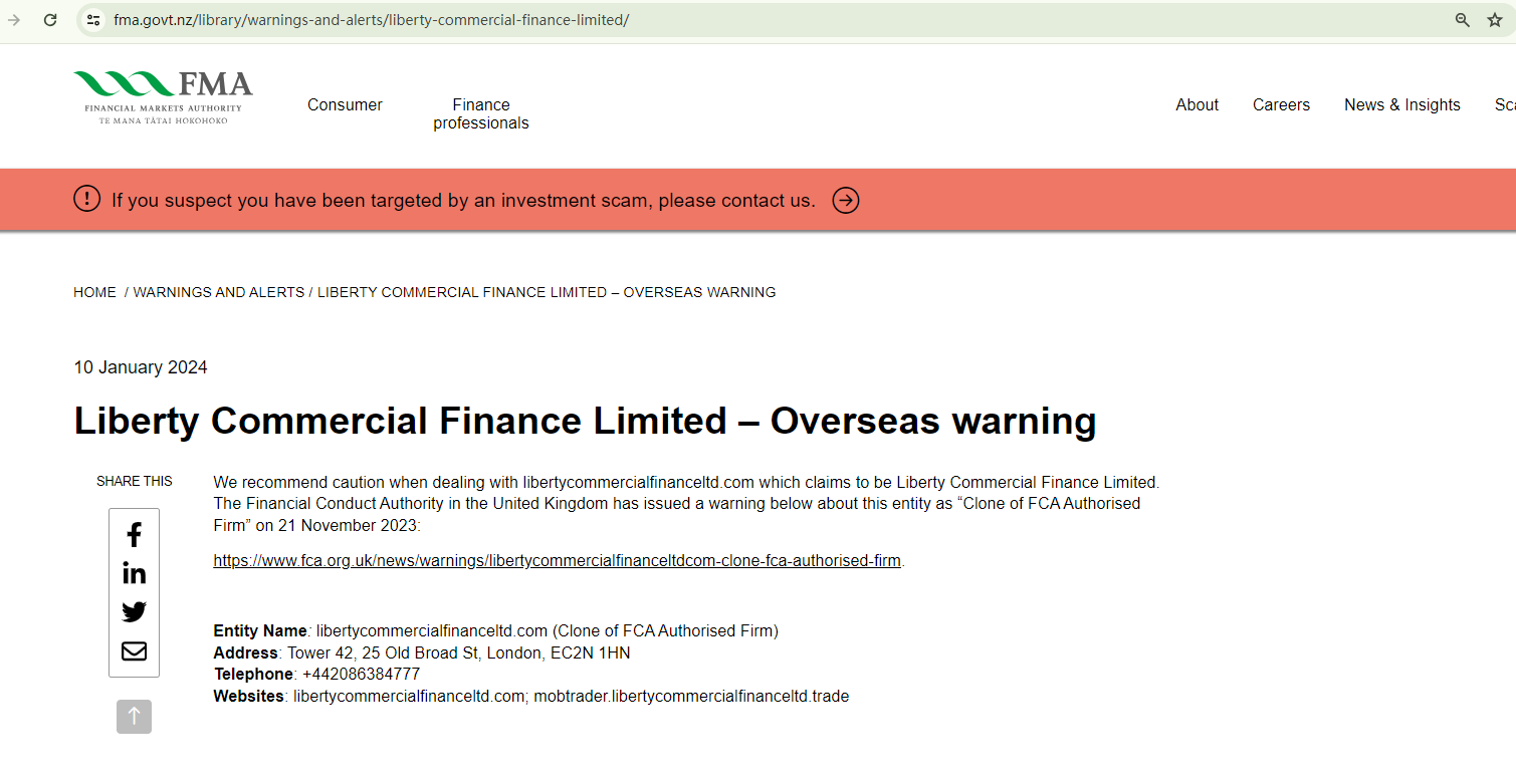 On January 10, 2024, the Financial Markets Authority (FMA) recommended caution when dealing with libertycommercialfinanceltd.com which claims to be Liberty Commercial Finance Limited. https://www.fma.govt.nz/library/warnings-and-alerts/liberty-commercial-finance-limited/