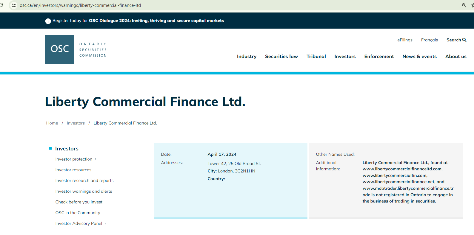 On April 17, 2024, the Ontario Securities Commission (OSC) issued a warning against libertycommercialfinanceltd.com, stating that this broker is not registered in Ontario to engage in the business of trading in securities. In addition to the existing websites the illicit company is running, the OSC has revealed two new sites: libertycommercialfinance.net, and mobtrader.libertycommercialfinance.trade. Investors should stay away from the scam and related websites. https://www.osc.ca/en/investors/warnings/liberty-commercial-finance-ltd