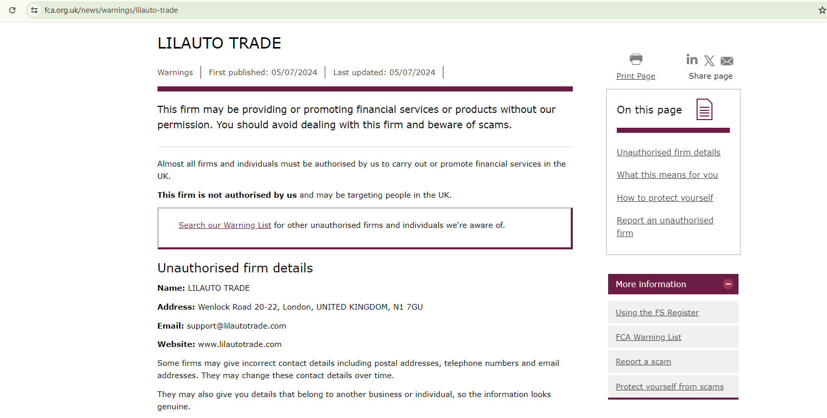Despite its UK-based claims, LILAUTO TRADE has been warned by the Financial Conduct Authority (FCA) for operating without the necessary authorization.