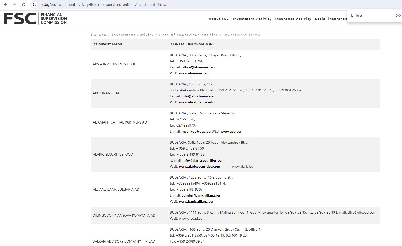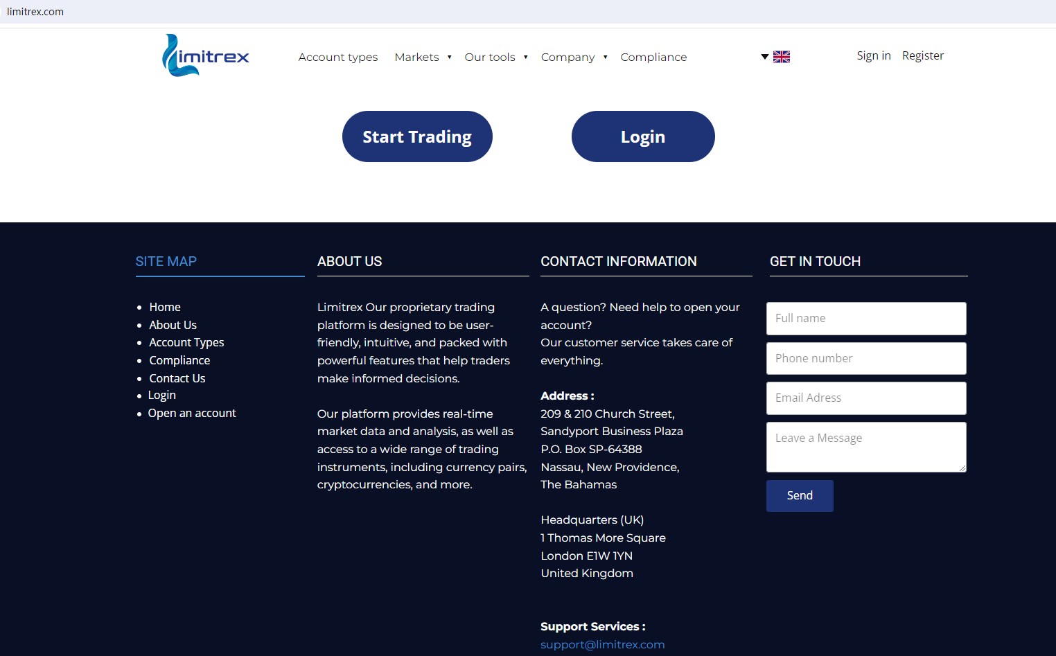 Limitrex claims to be a broker headquartered in the UK together with offices in France, Bahamas, Bulgaria and Luxembourg, offering wide range of financial services, including Forex, Metals, Indices, Futures, Stocks, Commodities and more instruments in global markets. But it lacks crucial regulatory information. A company that offers financial services must have financial license in the country where it is located.
