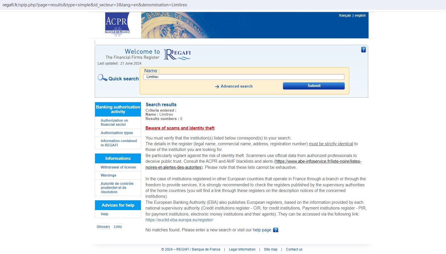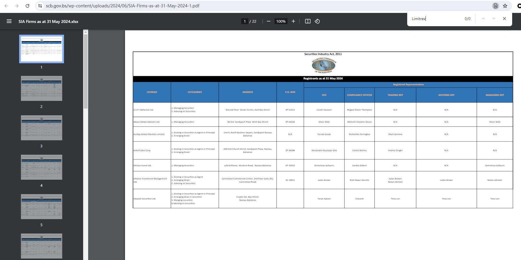 Our search of the United Kingdom Financial Conduct Authority (FCA), ACPR in France, th Securities Commission of The Bahamas (SCB), the Financial Supervision Commission (FSC) in Bulgaria and the Commission de Surveillance du Secteur Financier (CSSF) yielded no results.