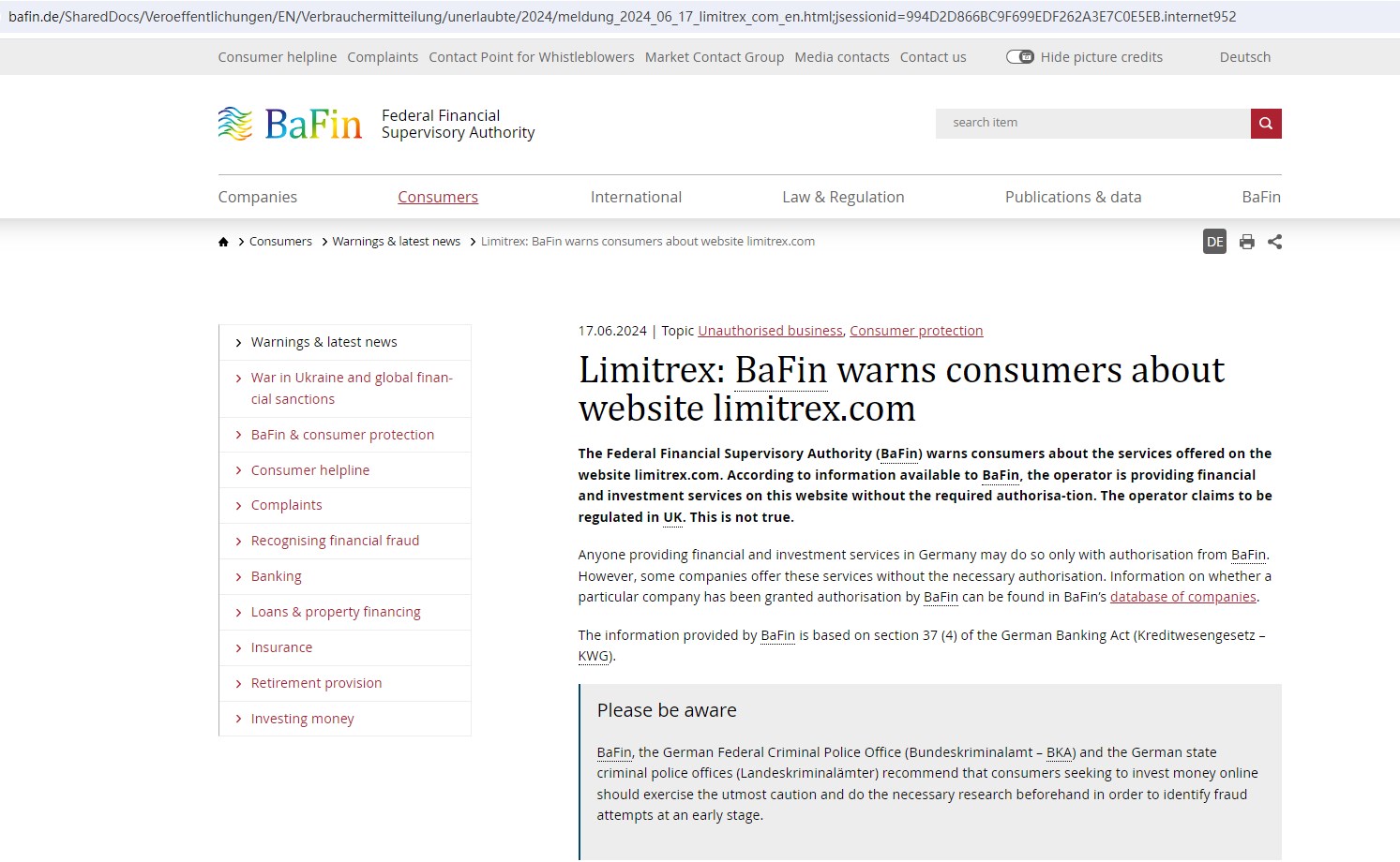 The Federal Financial Supervisory Authority (BaFin) issued a warning against limitrex.com, believing this company is providing financial and investment services on this website without the required authorisation.