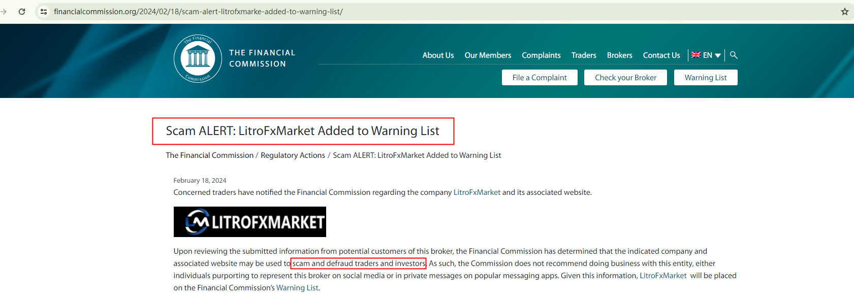 On February 18, 2024, the Financial Commission added LitroFxMarket to its warning list, identifying it as a scam broker. https://financialcommission.org/2024/02/18/scam-alert-litrofxmarke-added-to-warning-list/