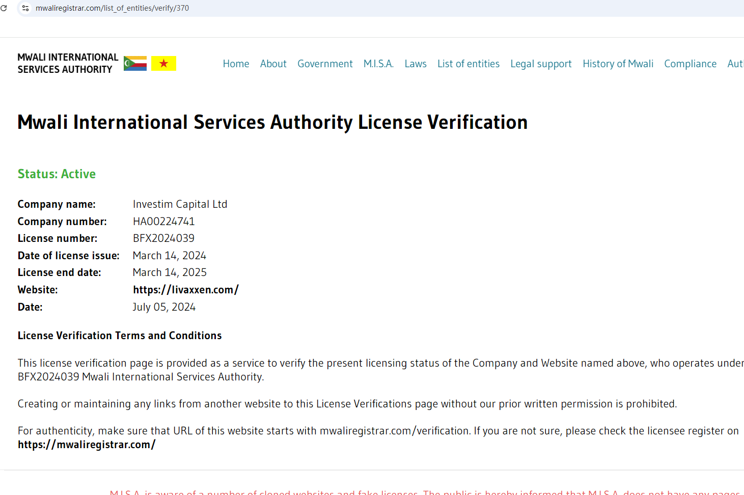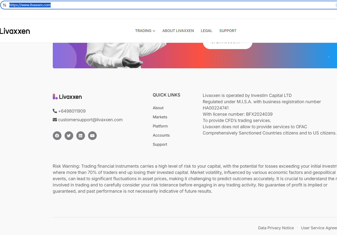 According to its website, it claims to be operated by Investim Capital LTD and regulated by MWALI INTERNATIONAL SERVICES AUTHORITY (MISA). Upon investigation, we found that the Livaxxen domain name is inconsistent with the domain name registered on MISA. It is clear that Livaxxen has stolen the information of the compliant company. Investors are advised to stay away.