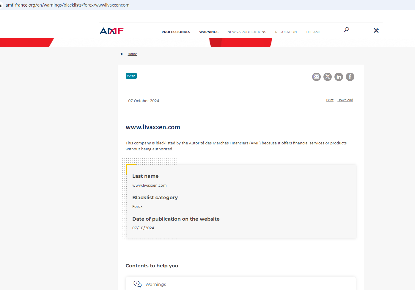 In addition, the Financial Authority (Autorité des Marchés Financiers, AMF) added Livaxxen to the warning list for it being an unauthorized company engaging in forex activities.