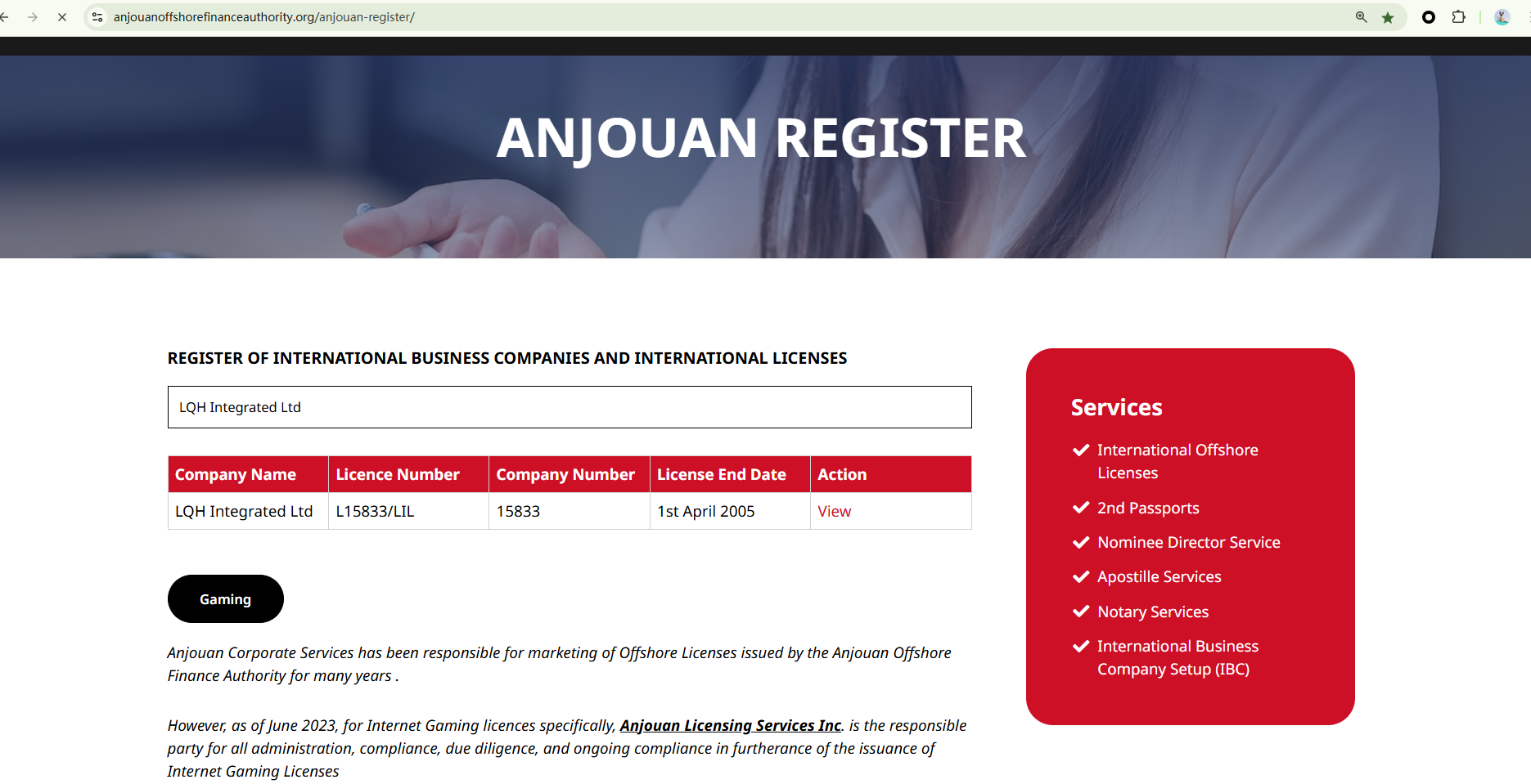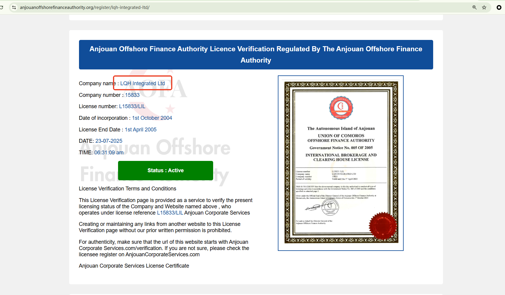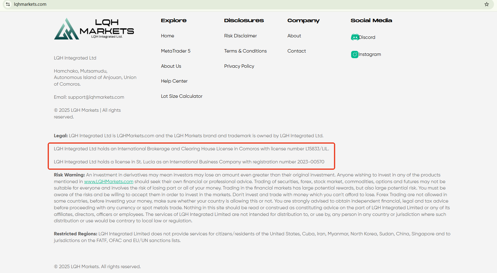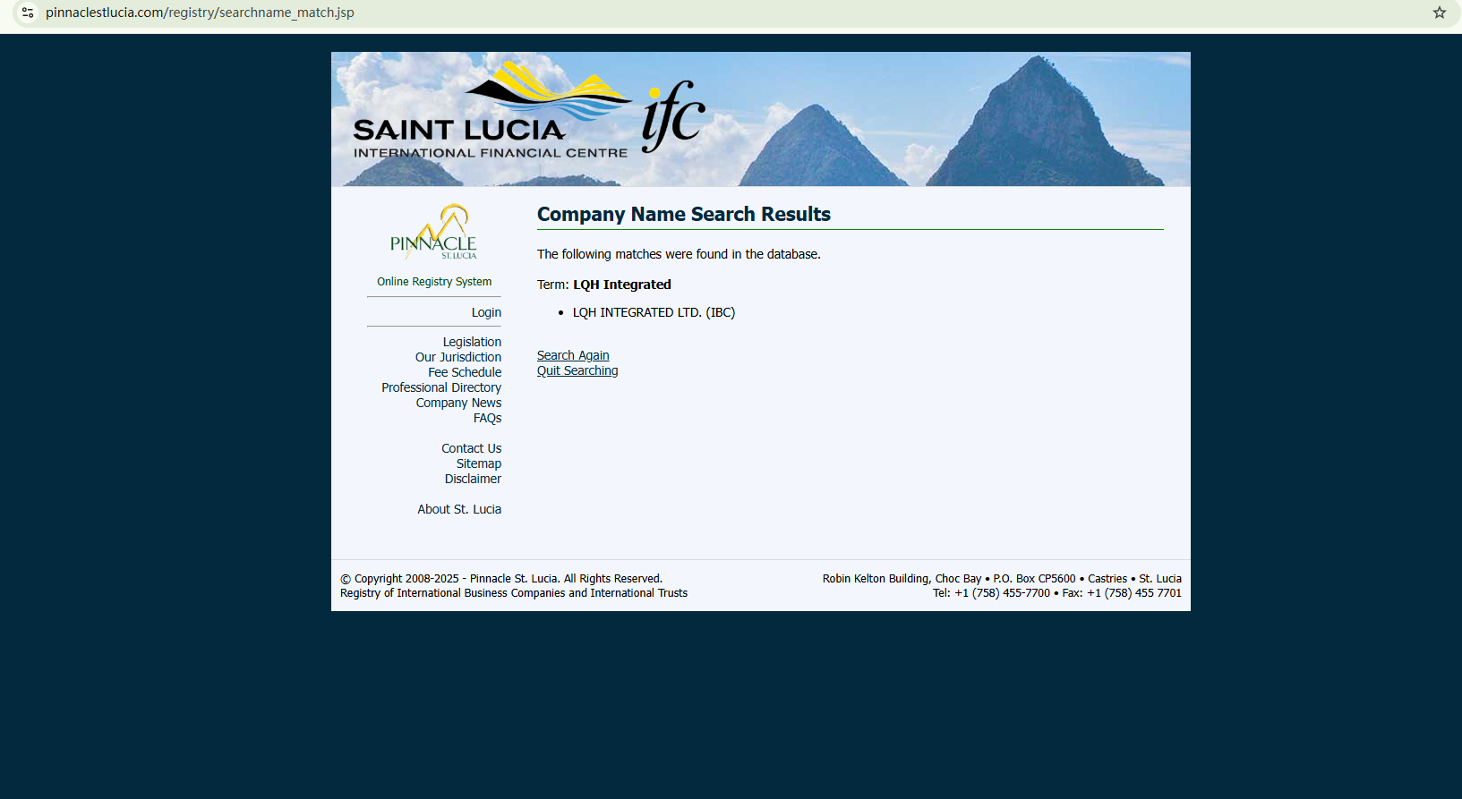 LQH Markets claims to be a trading name of LQH Integrated Ltd, which reportedly holds an International Brokerage and Clearing House License in Comoros. While the company is listed in the Anjouan Offshore Finance Authority (AOFA) registry, AOFA is an offshore regulator with limited international oversight, raising doubts about the credibility of its regulatory standards. LQH Markets also claims to be licensed in St. Lucia, but its registration with the Saint Lucia International Financial Centre (IFC) only grants it International Business Company (IBC) status, not a valid financial or forex license. Given these inconsistencies, LQH Markets’ regulatory claims appear misleading, the platform may be operating fraudulently.