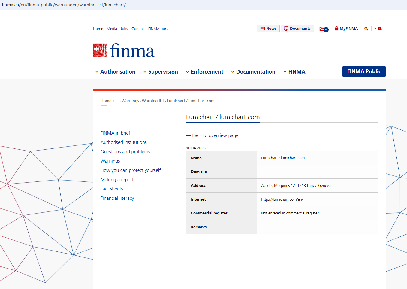 On April 10, 2025, the Swiss Financial Market Supervisory Authority (FINMA) issued a warning against Lumichart, stating that this broker was not entered in its commercial register. https://www.finma.ch/en/finma-public/warnungen/warning-list/lumichart/