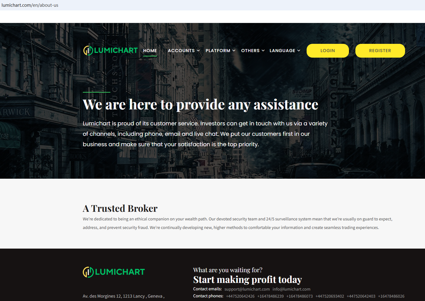 According to its website, it is based in Switzerland. However, we found that the Swiss Financial Market Supervisory Authority (FINMA) issued a warning against Lumichart, stating that this broker was not entered in its commercial register.