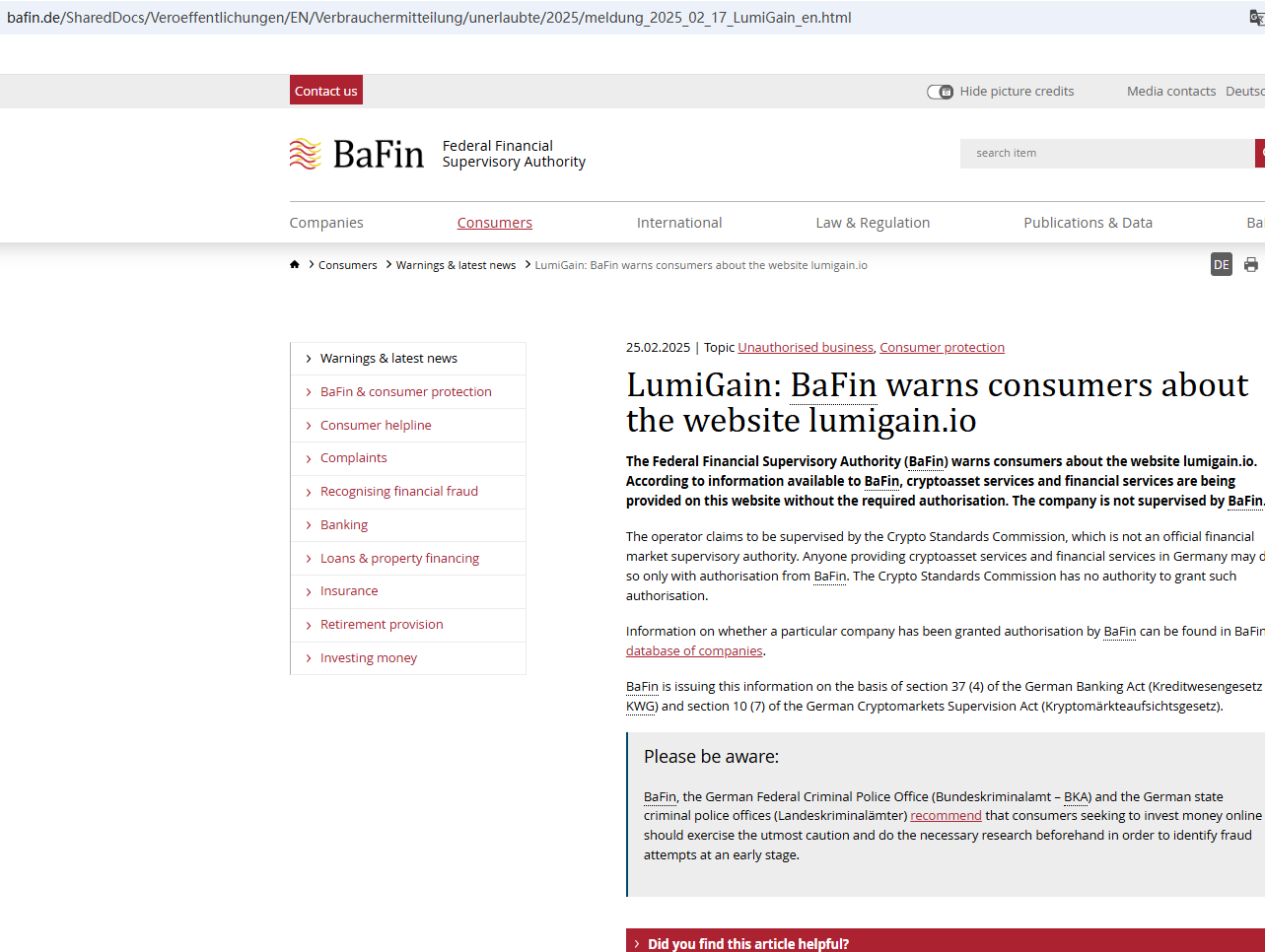On February 25 2025, the Federal Financial Supervisory Authority (BaFin) issued a warning against LumiGain, believing this company might be providing financial services or products without proper authorization. https://www.bafin.de/SharedDocs/Veroeffentlichungen/EN/Verbrauchermitteilung/unerlaubte/2025/meldung_2025_02_17_LumiGain_en.html