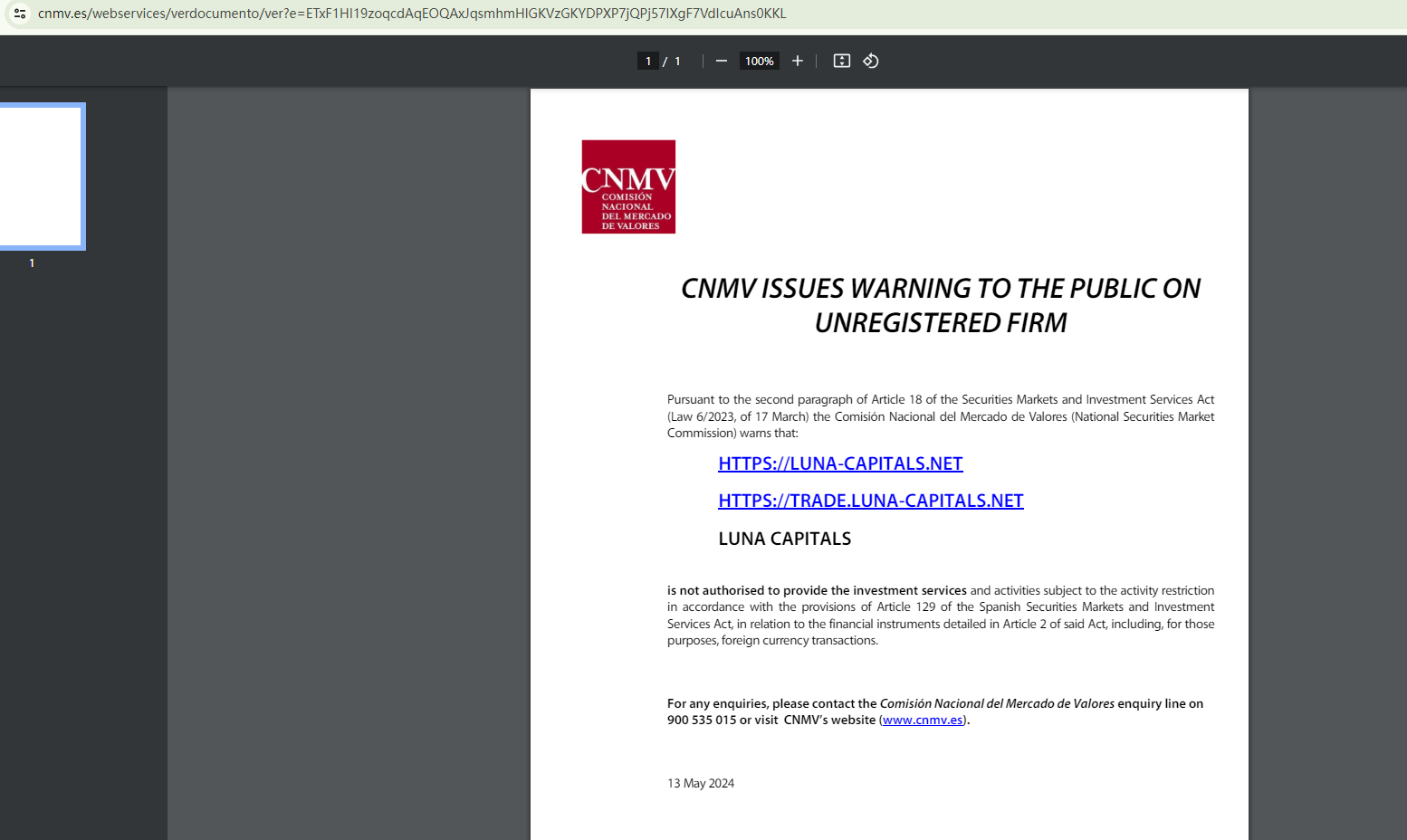 On May 13, 2024, the Comisión Nacional del Mercado de Valores (CNMV) added Luna Capitals to its warning list for providing investment services without authorization. https://www.cnmv.es/portal/ResultadoBusqueda.aspx?tipo=1&nombre=LUNA-CAPITALS