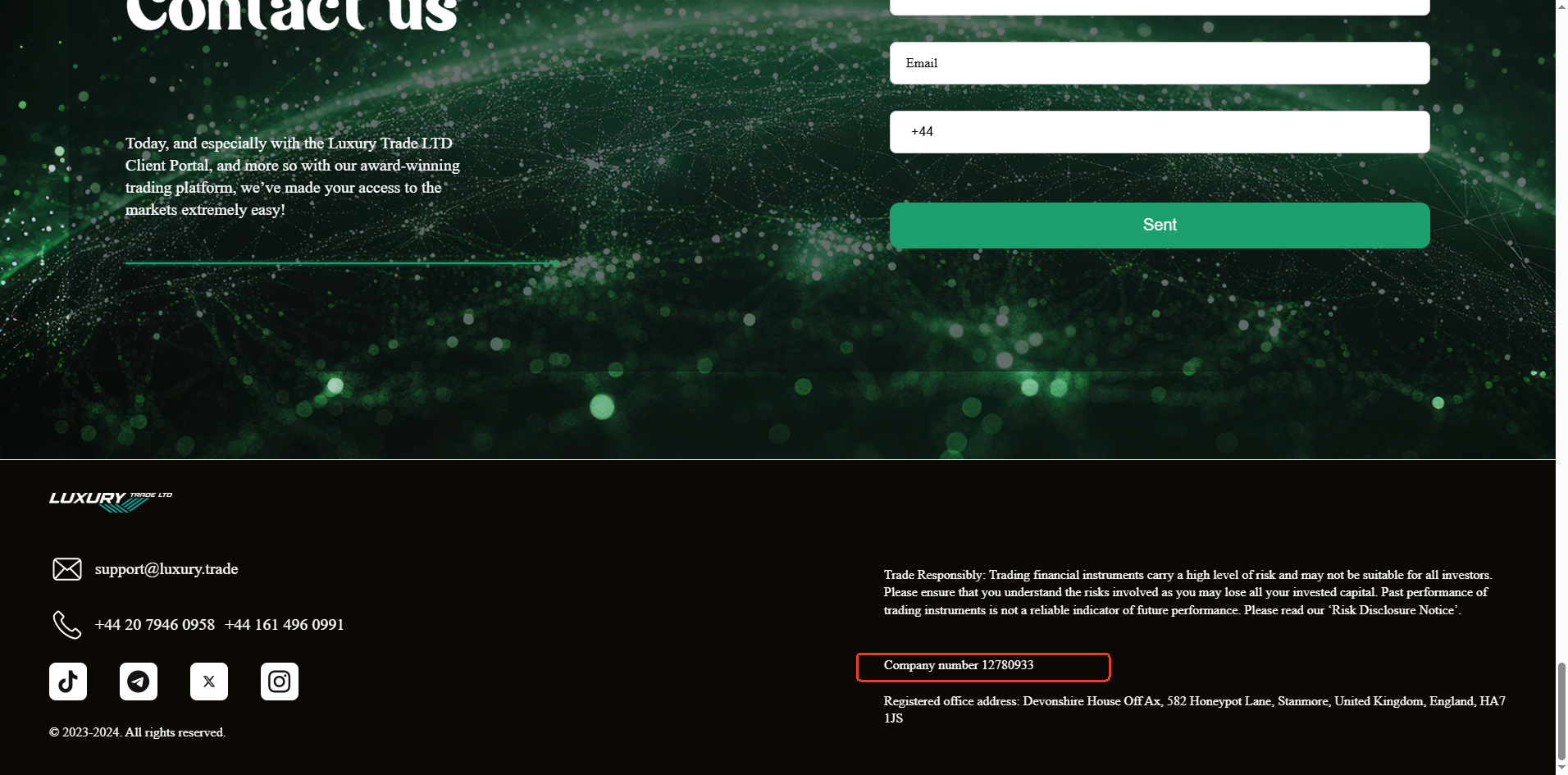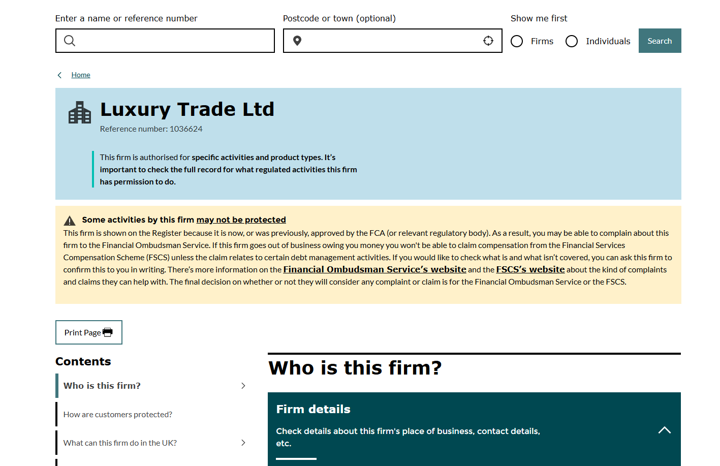 Luxury Trade LTD does not display any verifiable regulatory information on its website. The platform states that it is registered in the United Kingdom and provides a UK company address. Our investigation reveals that in the Financial Conduct Authority (FCA) register, a company named Luxury Trade LTD listed as a licensed entity. However, the domain associated with this FCA-authorized entity does not match the website operated by Luxury Trade LTD. This means the platform is actually not licensed by the FCA or any other reputable financial regulator to offer trading, investment, or brokerage services.