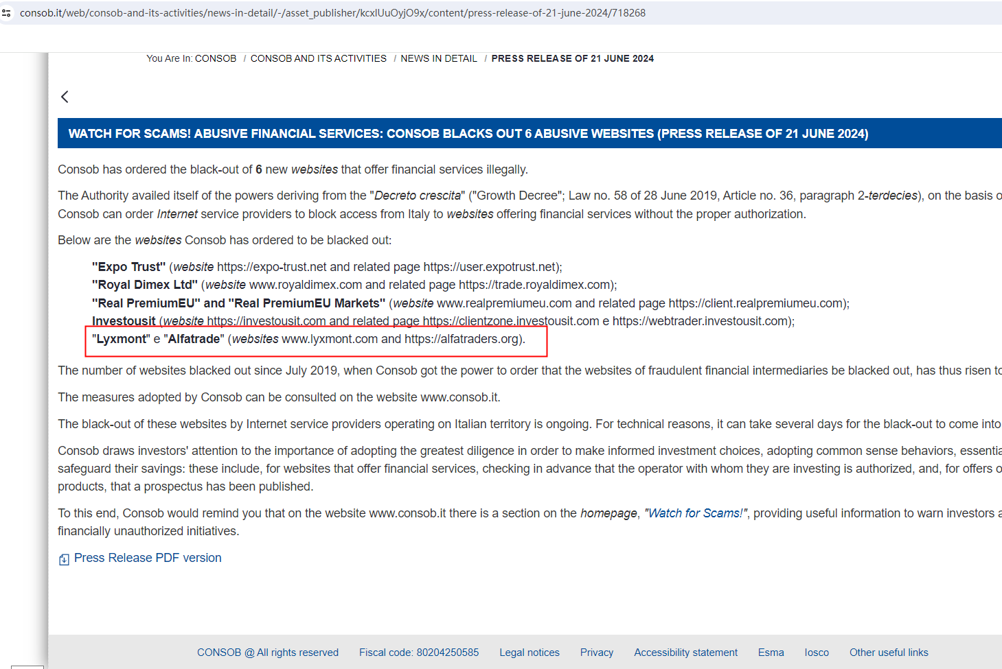 On 21 June 2024, the Commissione Nazionale per le Società e la Borsa (CONSOB) issued a warning that Lyxmont was providing financial services or products without authorisation. You may visit: https://www.consob.it/web/consob-and-its-activities/news-in-detail/-/asset_publisher/kcxlUuOyjO9x/content/press-release-of-21-june-2024/718268