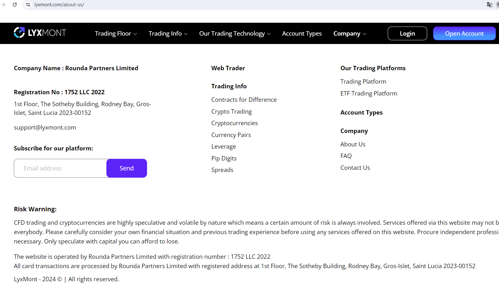 According to its website, the website is operated by Rounda Partners Limited. It is located in the Saint Lucia. Upon investigation, no matching information was found in the Financial Services Regulatory Authority (FSRA). In addition, it displays a registration number, obviously, this is the registration number of the Financial Services Authority (FSA), but we found that the license holding entity is inconsistent with the company name claimed by the platform.