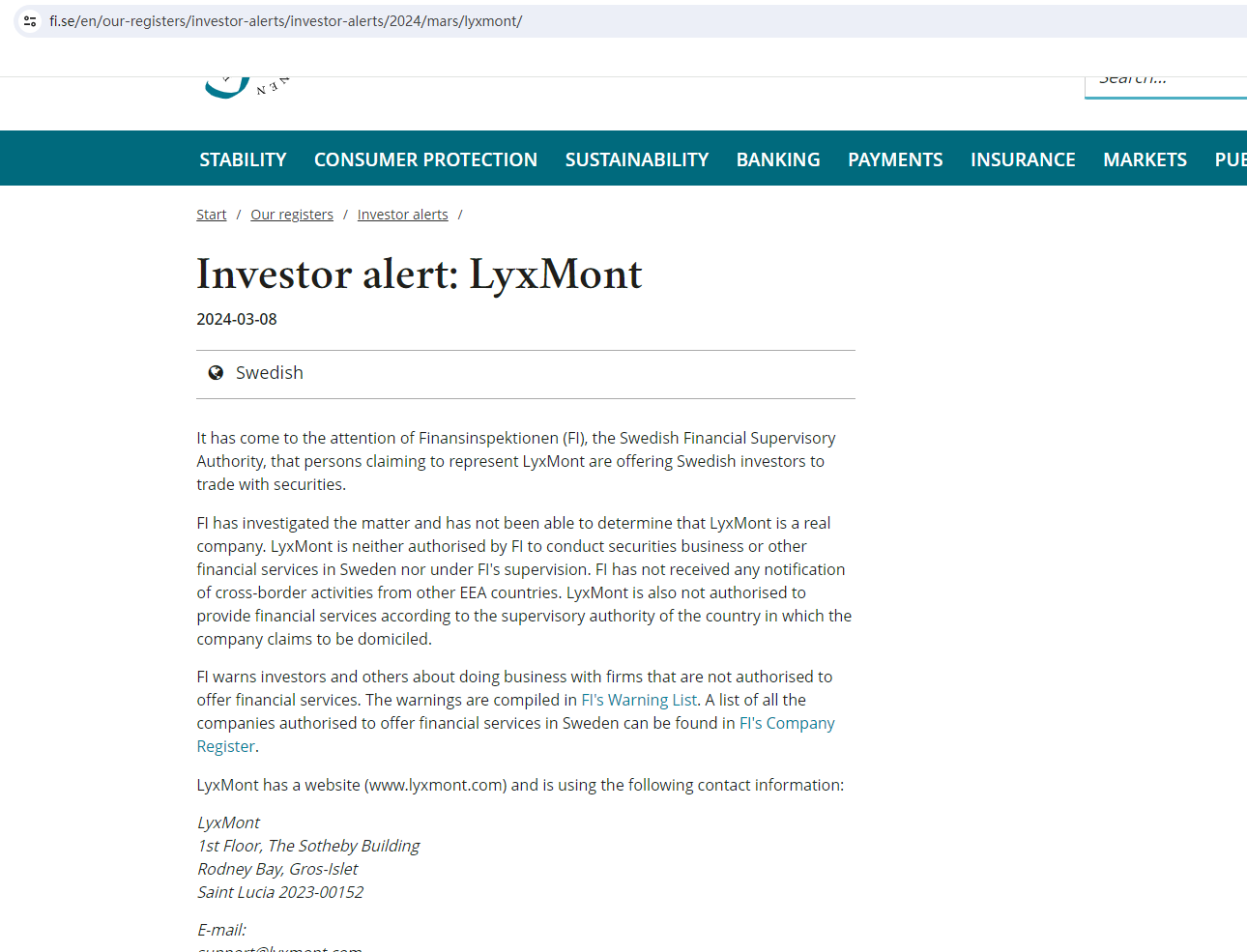On March 8, 2024, the Finansinspektionen (FI) added LyxMont to its warning list for providing investment services without authorization. https://www.fi.se/en/our-registers/investor-alerts/investor-alerts/2024/mars/lyxmont/