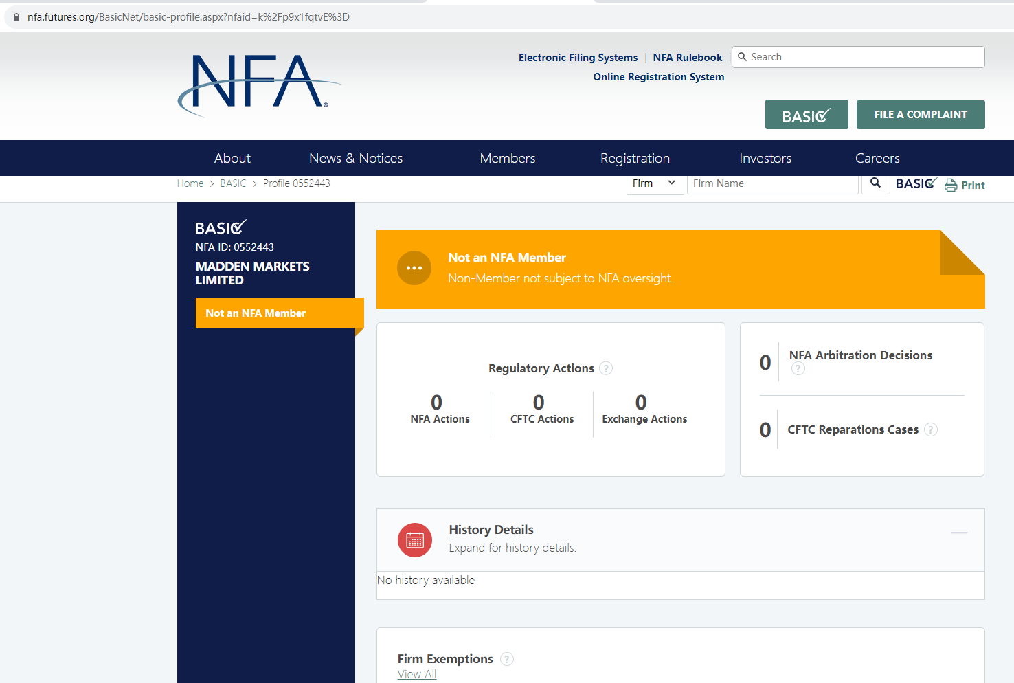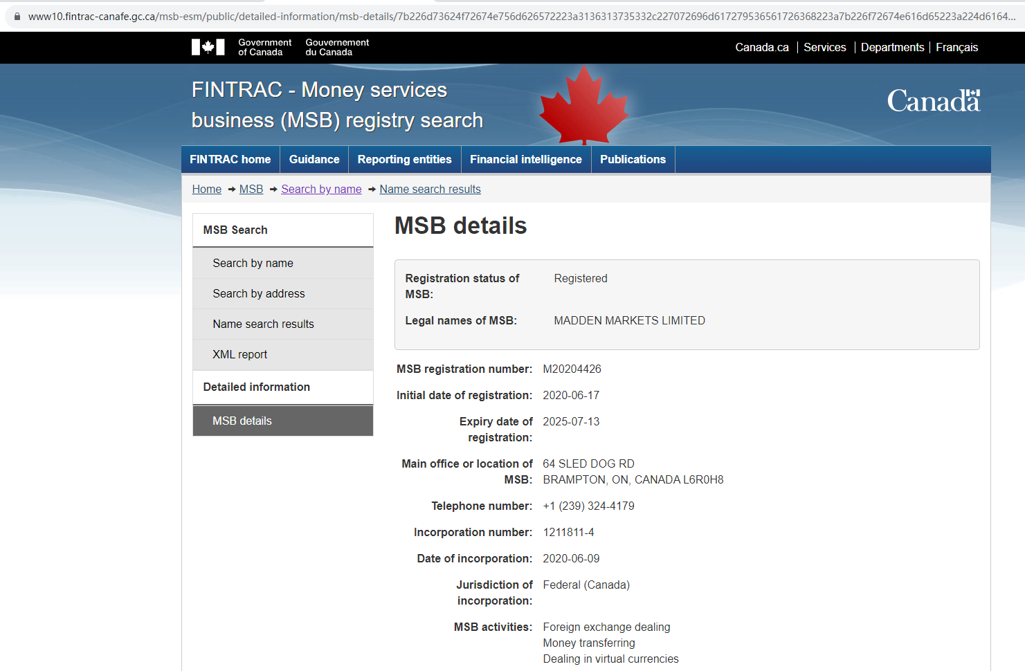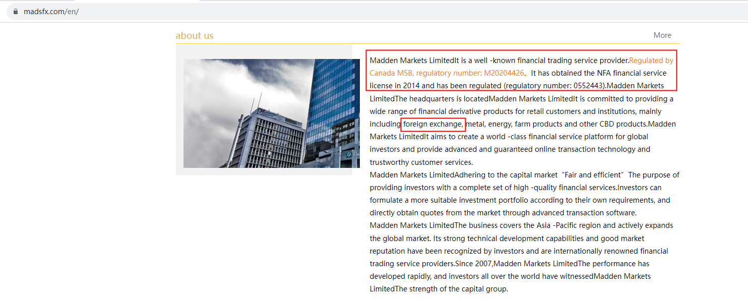 Madden Markets claims to be regulated by Financial Transactions and Reports Analysis Centre of Canada (FINTRAC) and National Futures Association (NFA). We searched the FINTRAC and NFA, found a matching result. But FINTRAC doesn't regulate forex or issue forex licenses, so having registration does not mean being authorized to provide financial services. And Madden Markets is not an NFA member and thus not subject to the regulator's oversight. Its NFA ID is only for tracking purposes only. The truth is that Madden Markets is not under valid regulation by any regulators to do forex. Investors' funds in this broker are unsafe and cannot be protected by any law.