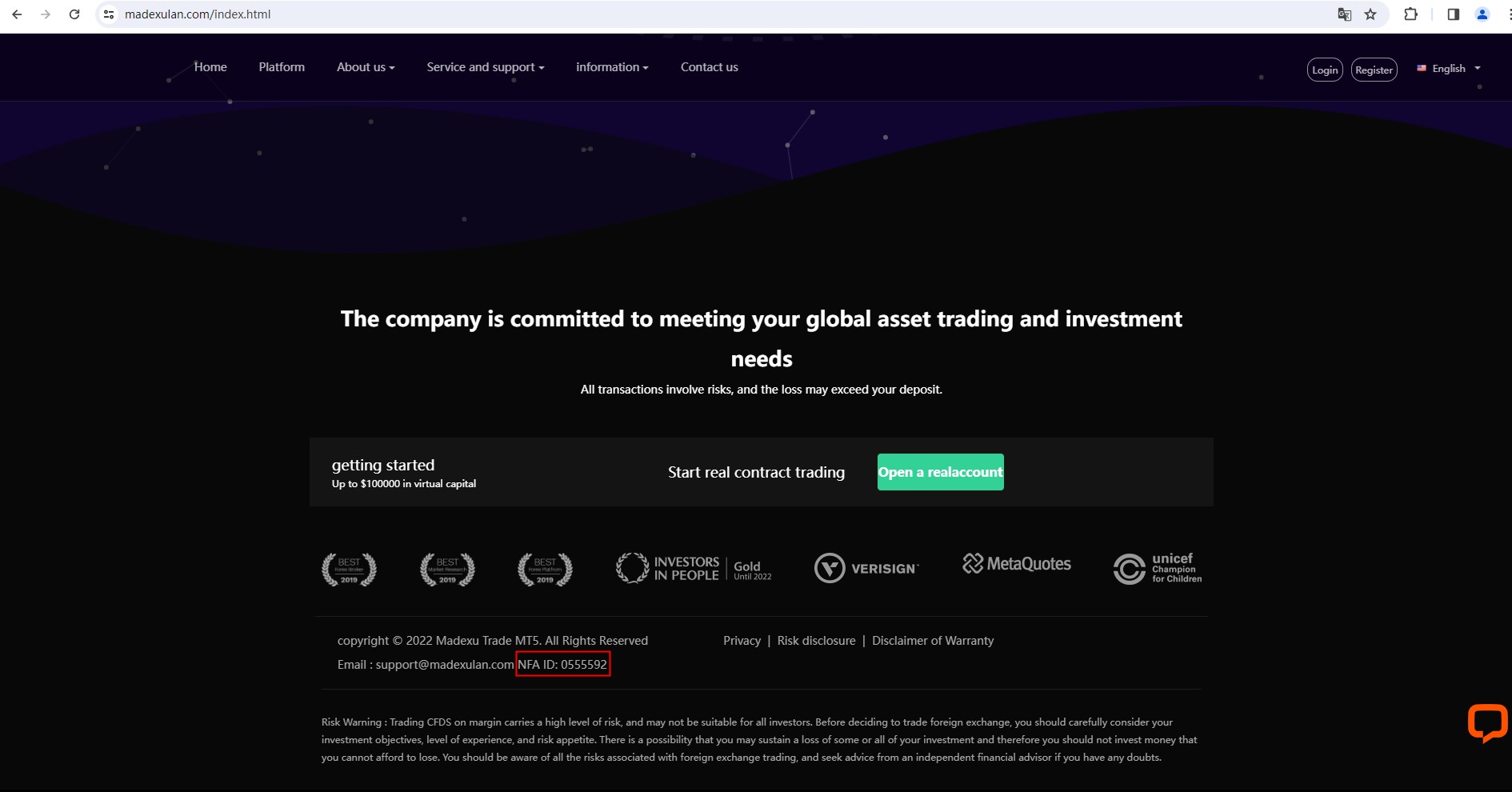 Madexu Trade MT5 claims to be headquartered in the UK. It conducts CFD trading in Forex, stocks, indices, commodities, Bitcoin, metals and energy. It has direct branches in the United States, Canada and Australia, and is regulated by the Financial Conduct Authority (FCA), the Australian Securities and Investments Commission (ASIC), the Japan Financial Services Agency (Japan FSA), and the Central Bank of Ireland (CBI).