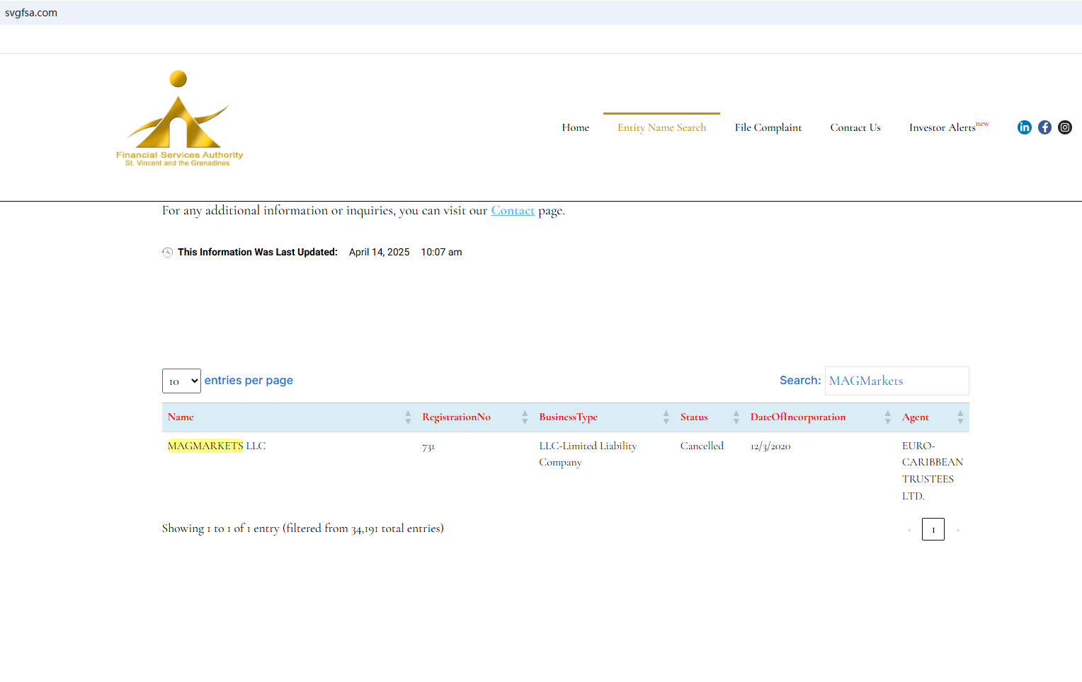 According to its website, it is located in St. Vincent, but the certificate issued by the Financial Services Authority (SVG FSA) has been cancelled. All these signs indicate that MAGMarkets faces significant risks. Investors should monitor developments and remain vigilant.