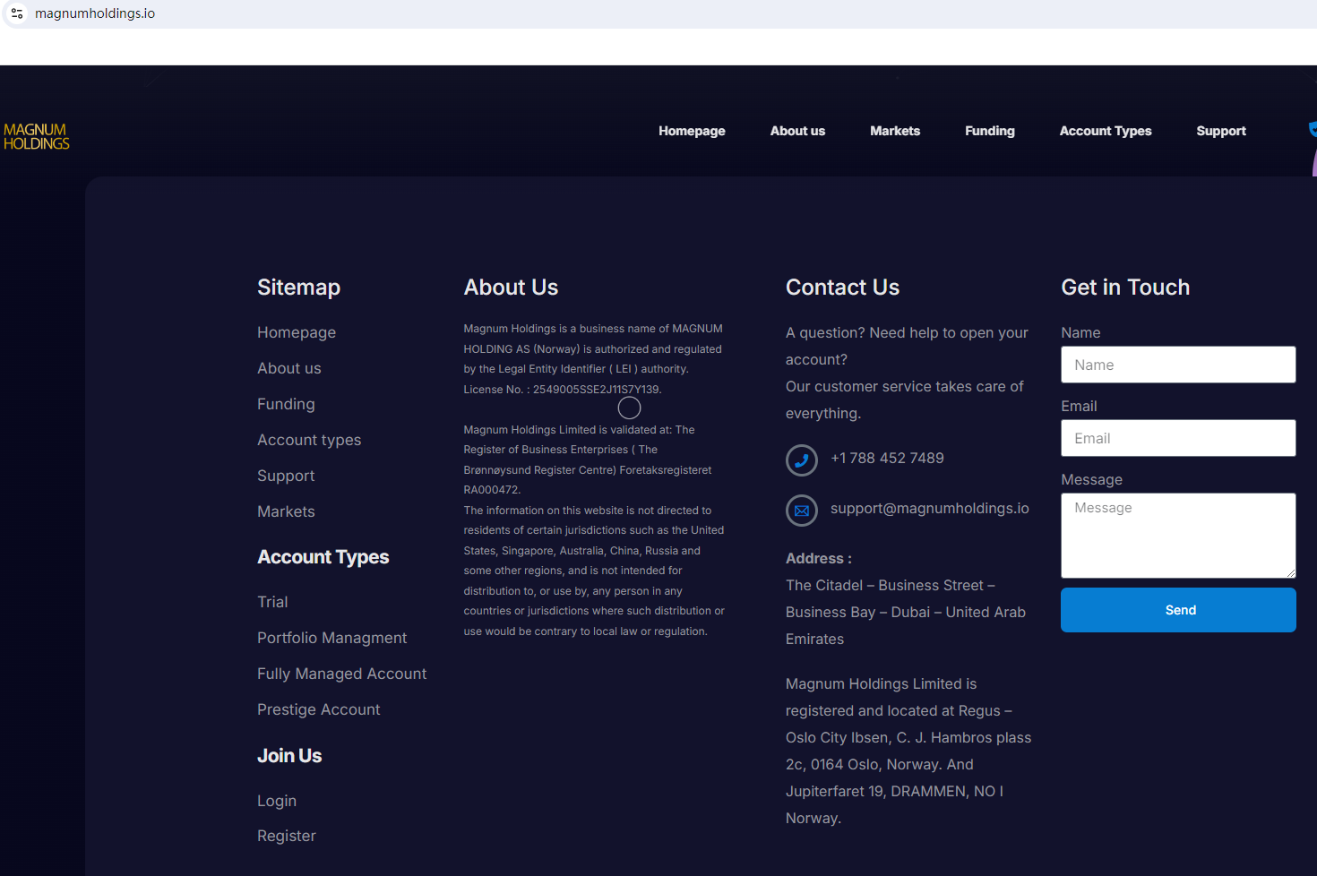 According to its website, it claims to be regulated and provides two addresses: Norway and Dubai. Upon investigation, no matching information was found in the Finanstilsynet, Norway (Norway FSA), Central Bank of U.A.E. (CBUAE), DuBai Financial Services Authority (DFSA), and Securities and Commodities Authority (SCA).