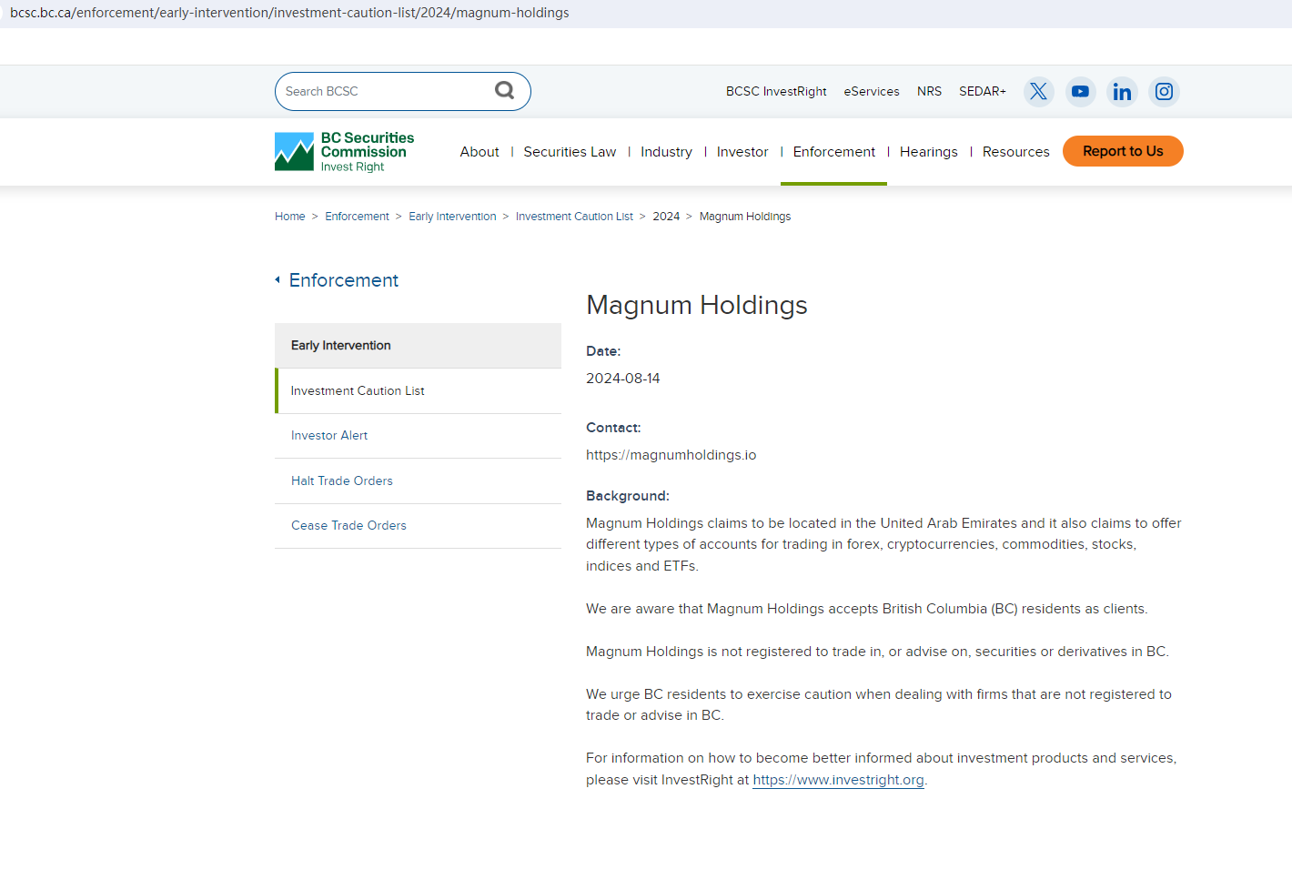 On August 14, 2024, the BC Securities Commission Invest Right (BCSC) issued a warning against Magnum Holdings believing this company might be providing financial services or products without proper authorization. https://www.bcsc.bc.ca/enforcement/early-intervention/investment-caution-list/2024/magnum-holdings