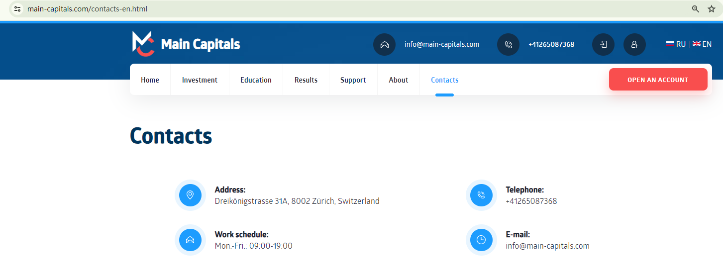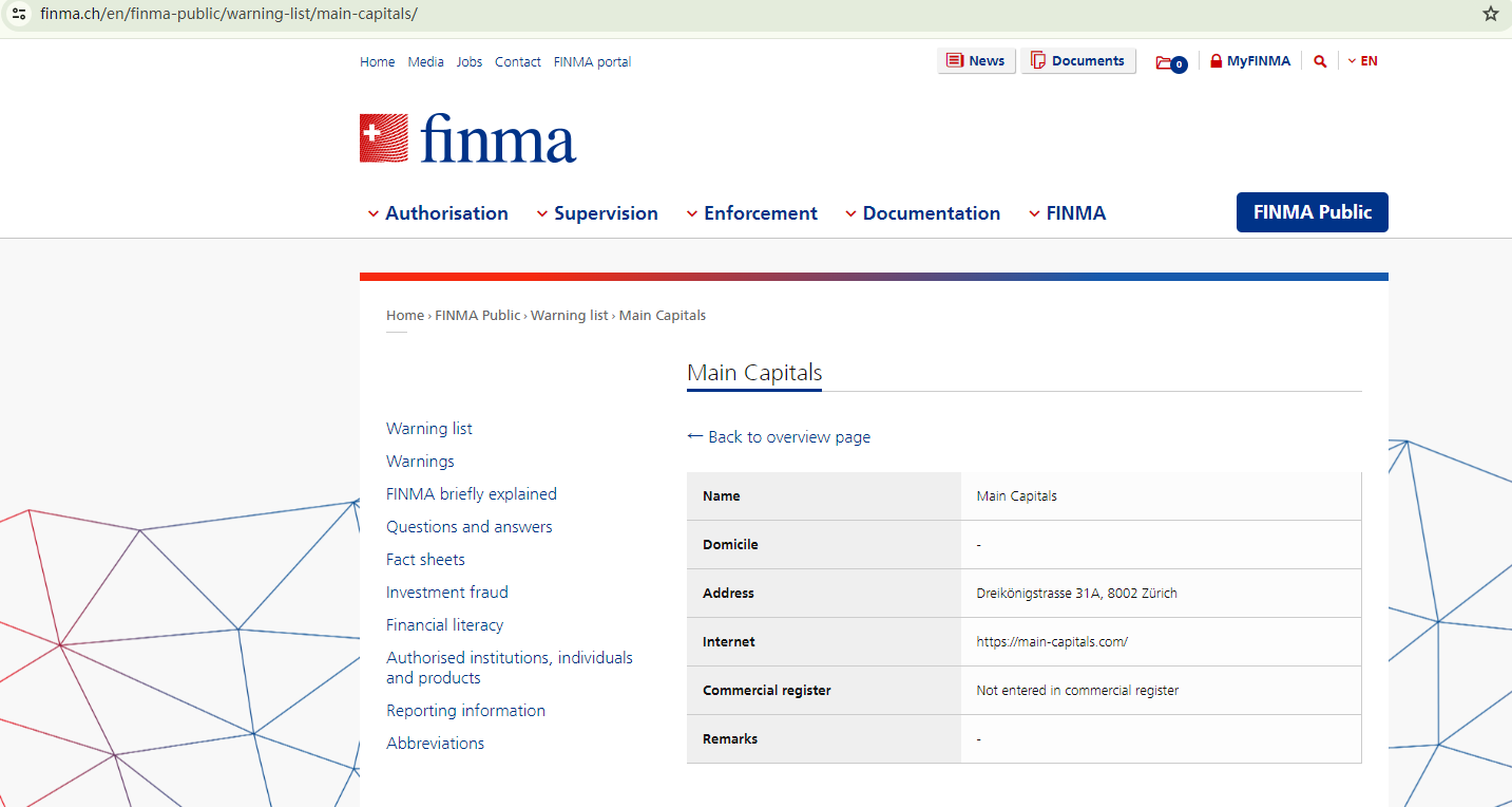 Although it provides a Swiss office address on its website, it does not adhere to Swiss regulations. The Swiss Financial Market Supervisory Authority (FINMA) has included Main Capitals in its warning list due to its lack of commercial registration.