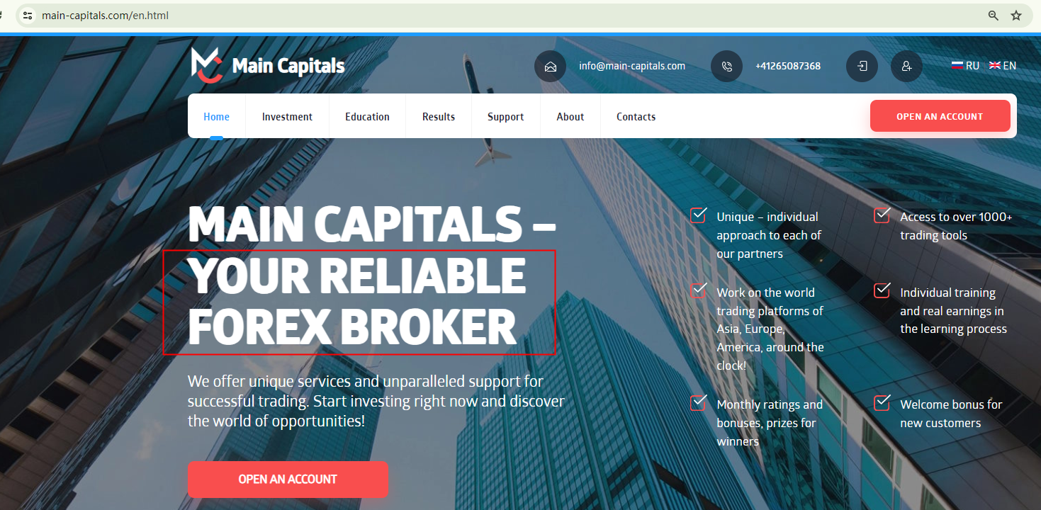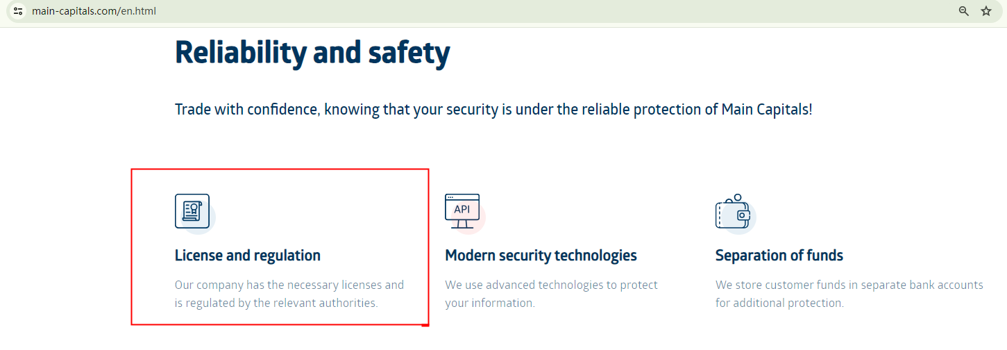 While Main Capitals purports to be a trustworthy, fully licensed broker, it does not provide any additional information about its regulatory status. This lack of regulatory disclosure is typically seen as a warning sign of potential scams.