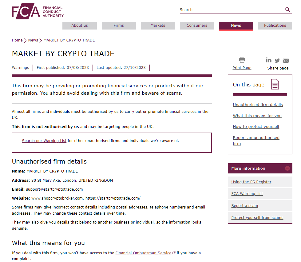 Furthermore, the Financial Conduct Authority (FCA) has issued a warning against MARKET by Crypto Trade, cautioning the public of this unauthorized firm.