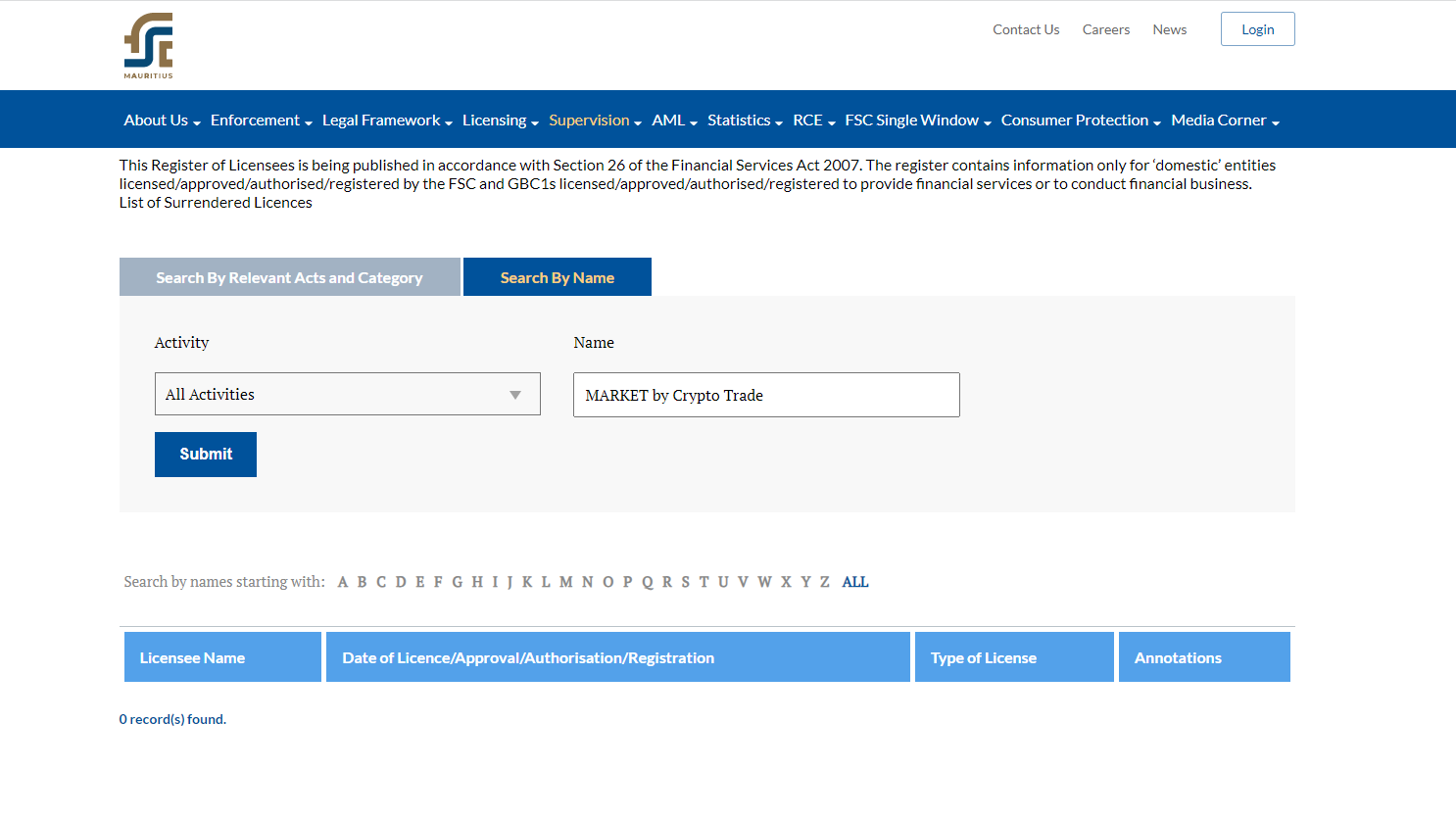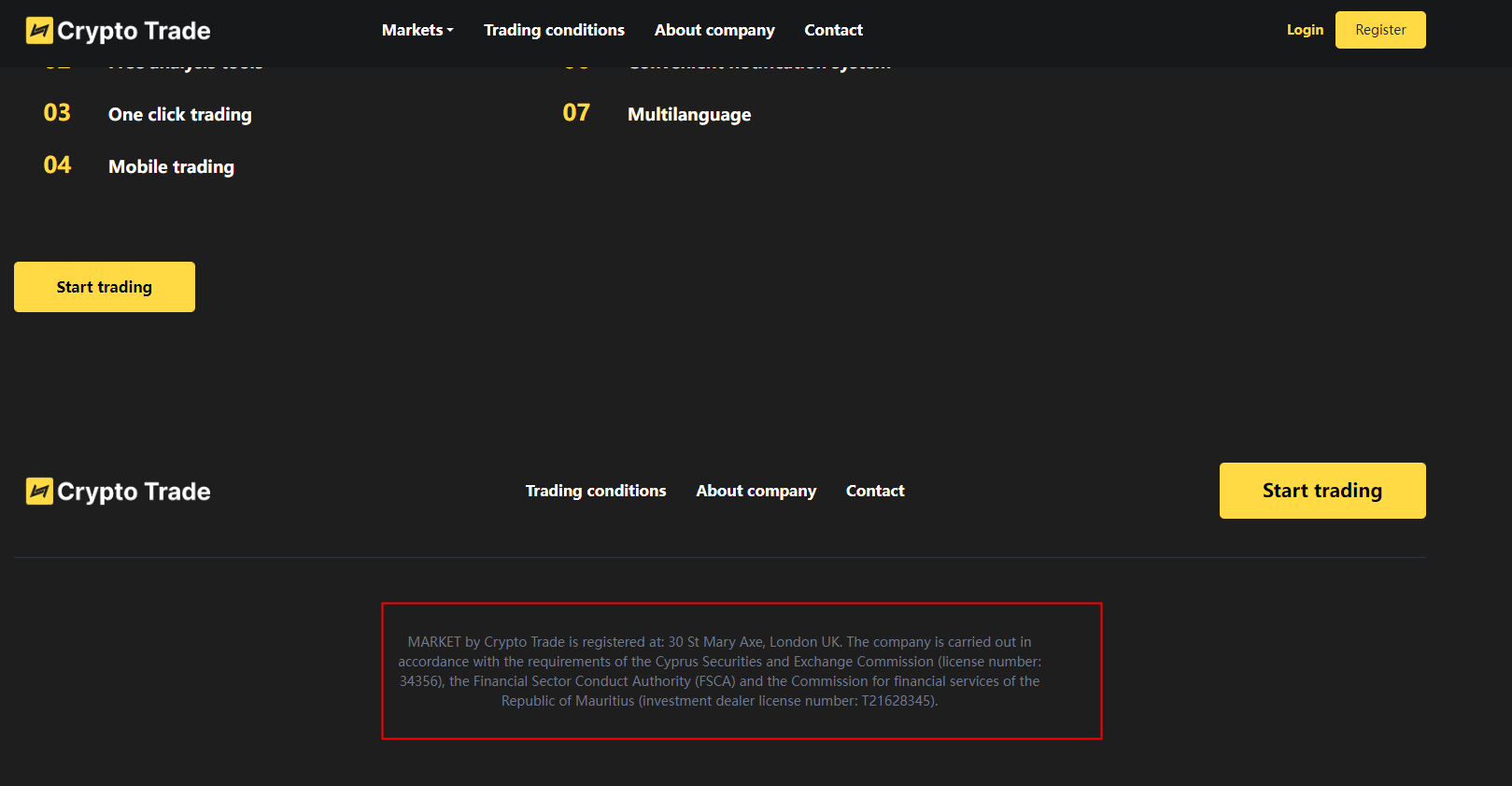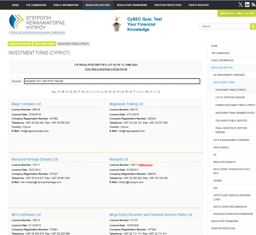 MARKET by Crypto Trade falsely claims to be regulated by the Cyprus Securities and Exchange Commission (CySEC) and the Commission for financial services of the Republic of Mauritiusthe (FSC), Financial Sector Conduct Authority (FSCA), as there are no matching records in the registers of both regulators.