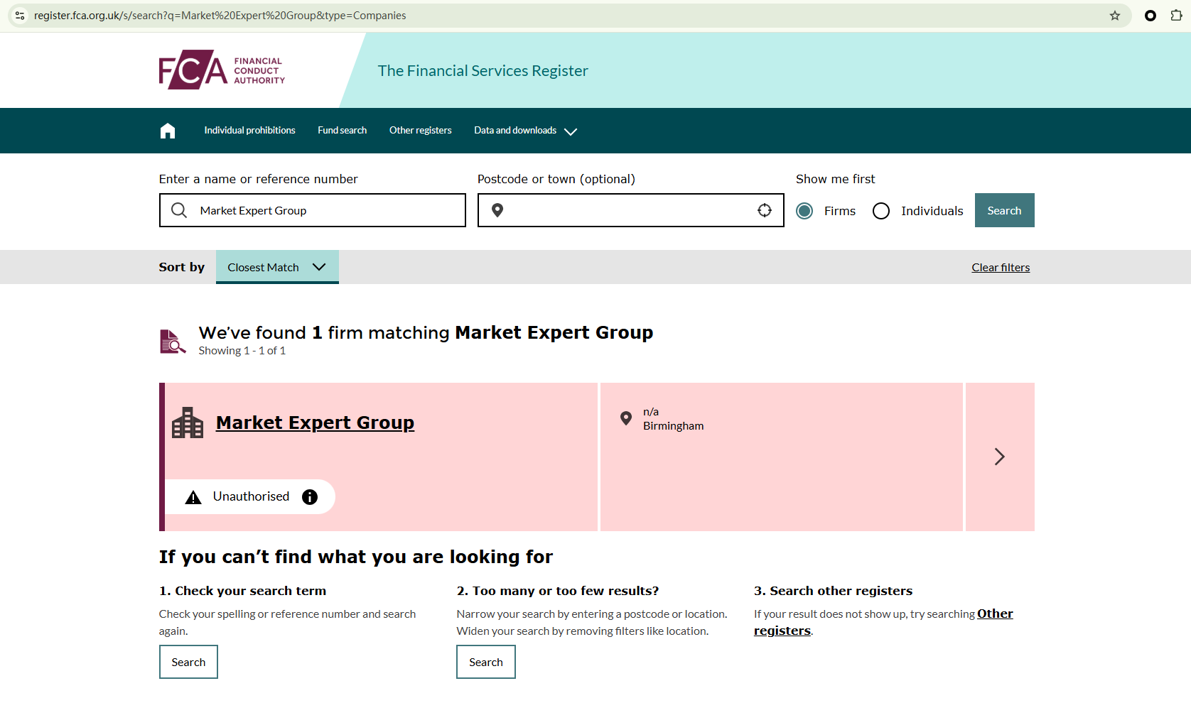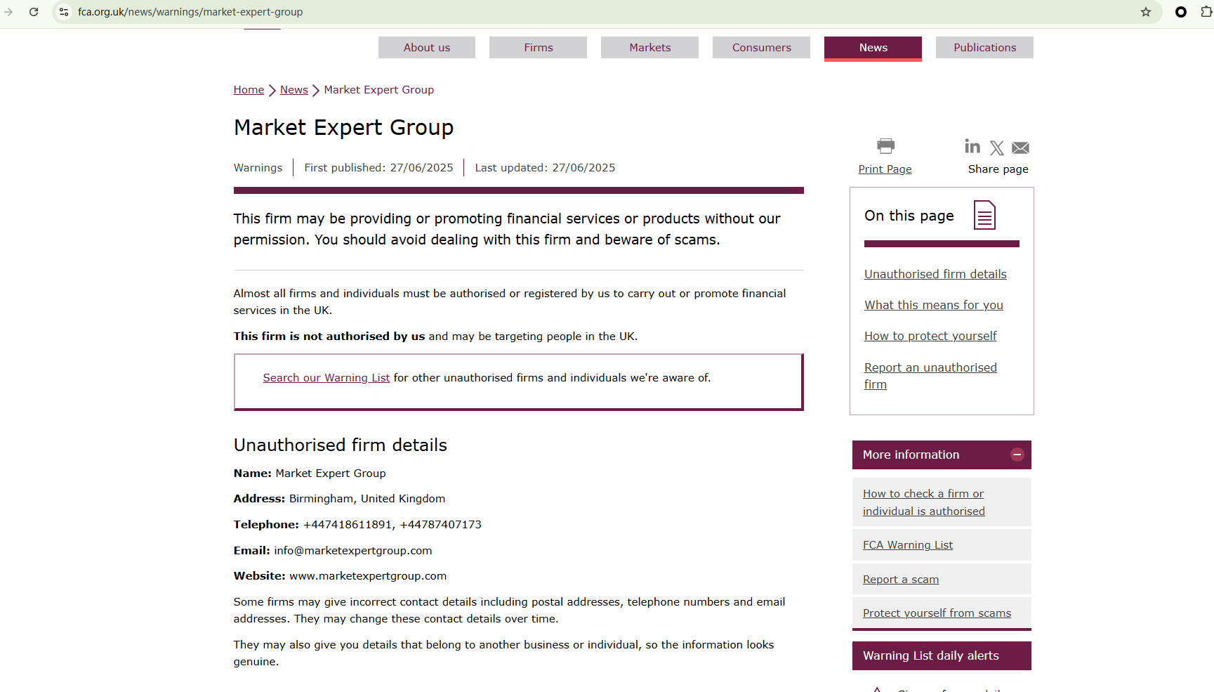 On Jun 27, 2025, the Financial Conduct Authority (FCA) issued a warning against Market Expert Group, believing this company might be providing financial services or products without proper authorization in the UK. https://www.fca.org.uk/news/warnings/market-expert-group