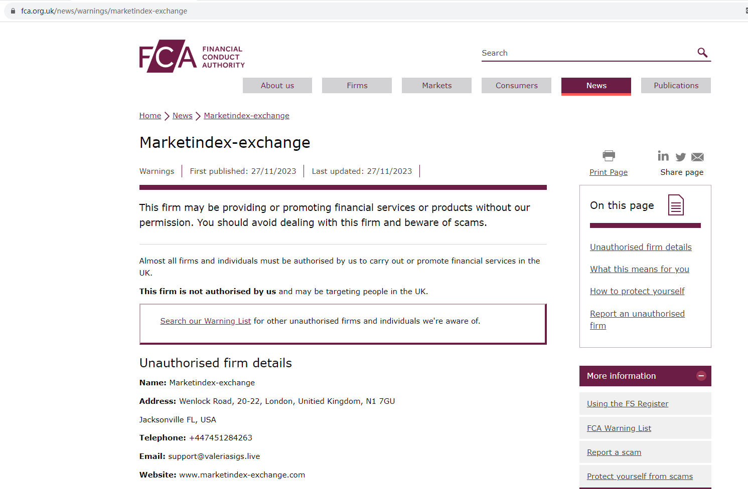 On 27 November 2023, the United Kingdom Financial Conduct Authority (UK FCA) issued a warning that Marketindex Exchange was providing financial services or products in the UK without authorisation. You may visit: https://www.fca.org.uk/news/warnings/marketindex-exchange