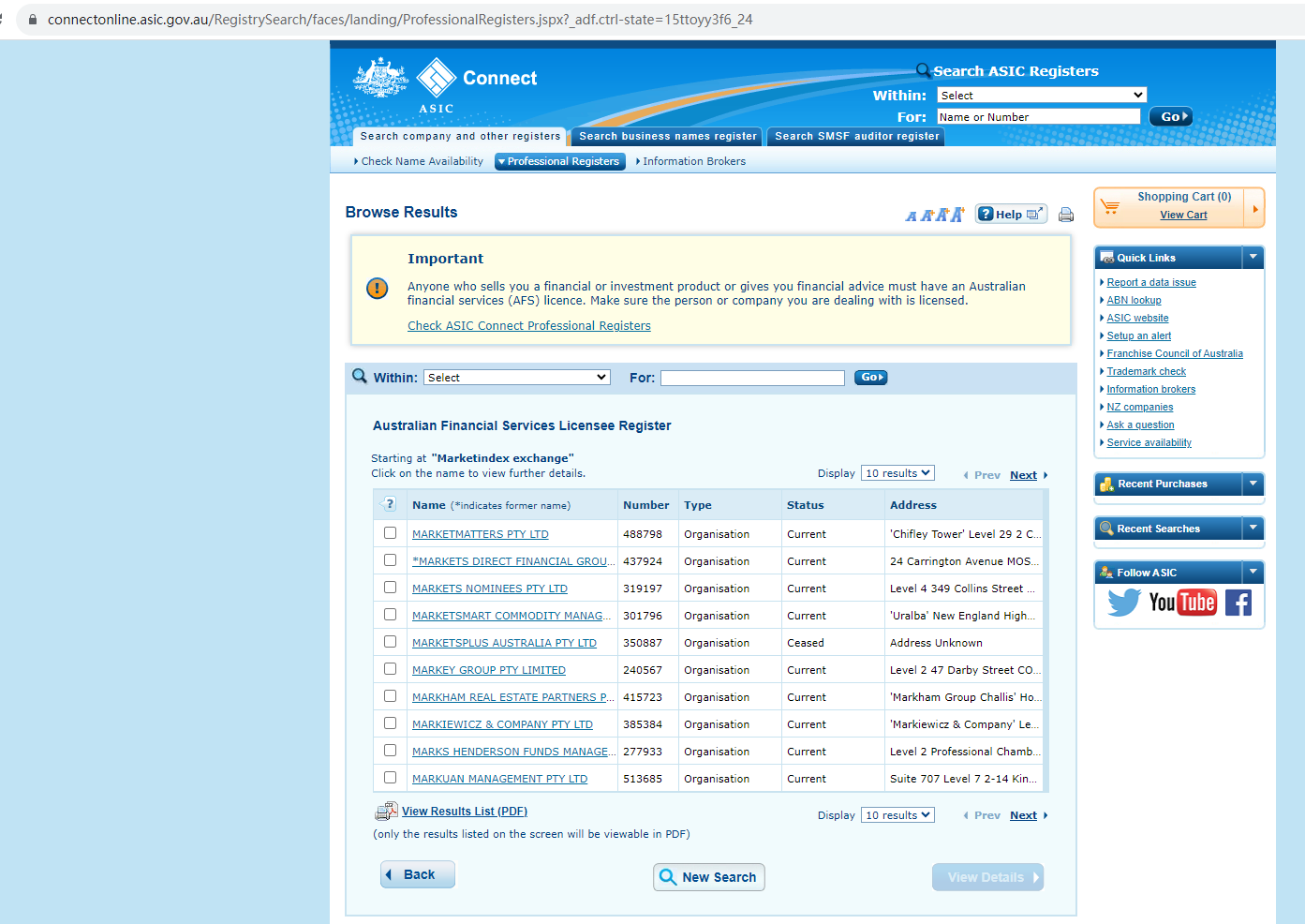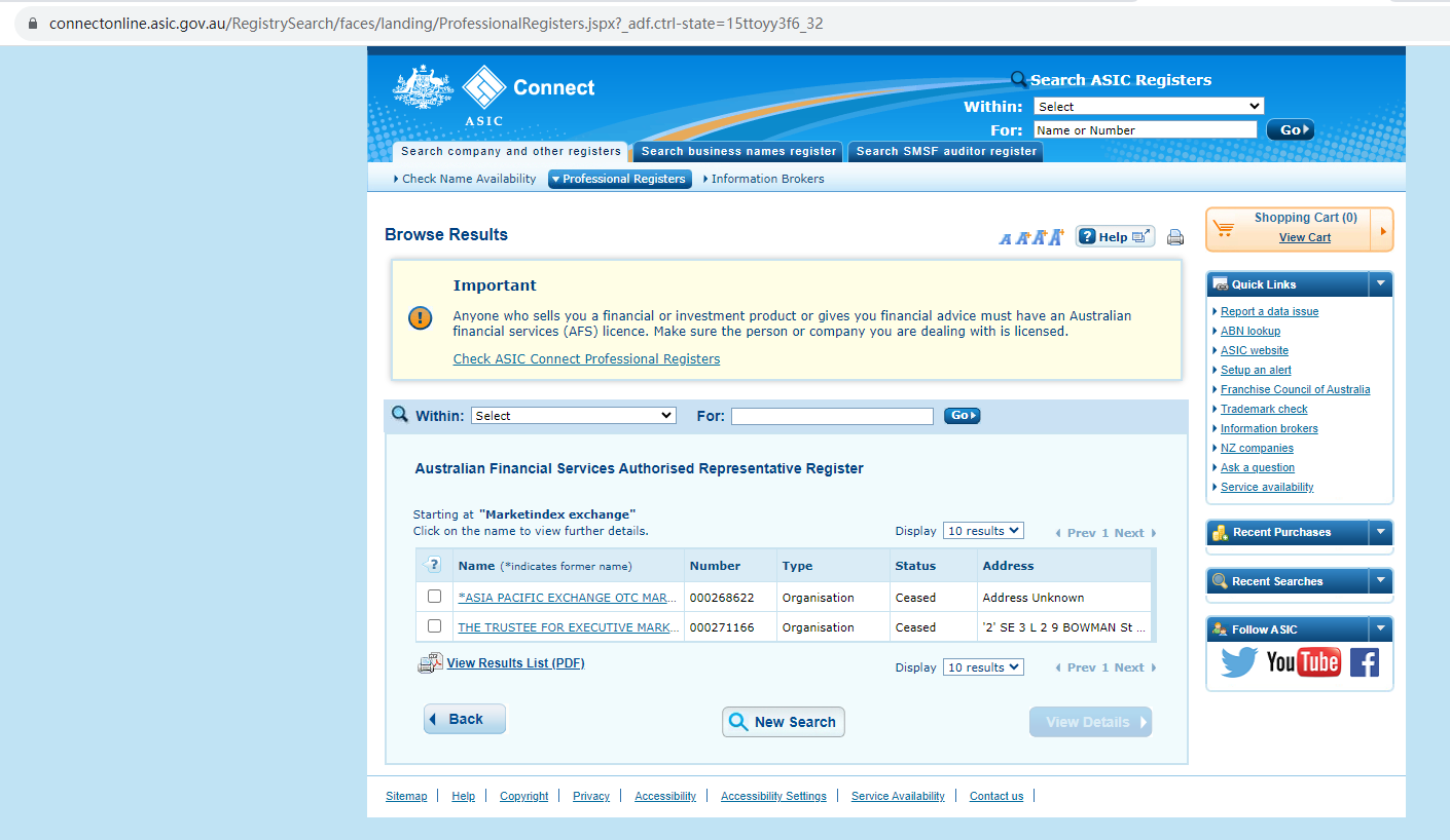Marketindex Exchange claims to be regulated by the Australian Securities and Investment Commission (ASIC), while we found no matching results on ASIC. It is a red flag.