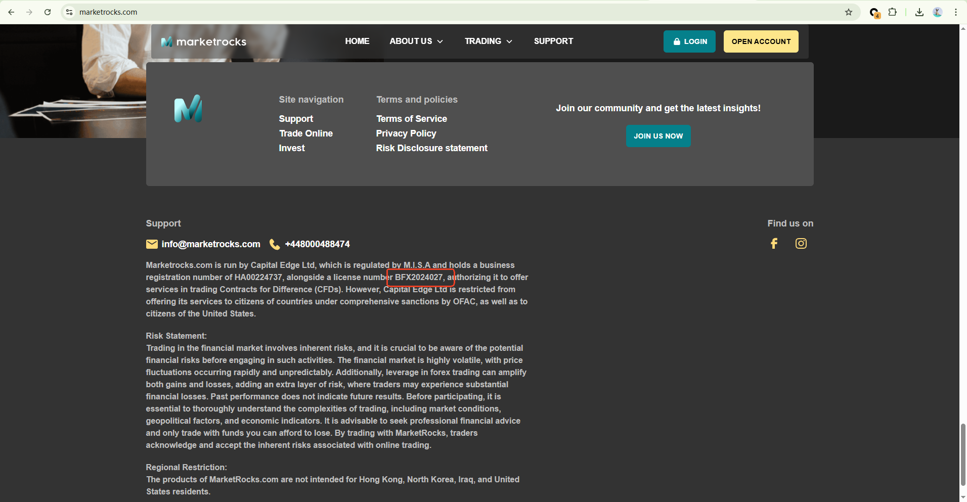 Marketrocks claims to be operated by Capital Edge Ltd, which was previously regulated by the MWALI International Services Authority (MISA) under license number BFX2024027. However, upon verification, we found that this license has been officially suspended. While Capital Edge Ltd was indeed an authorized licensee and the website domain matches the registered information, the regulatory status is no longer valid.