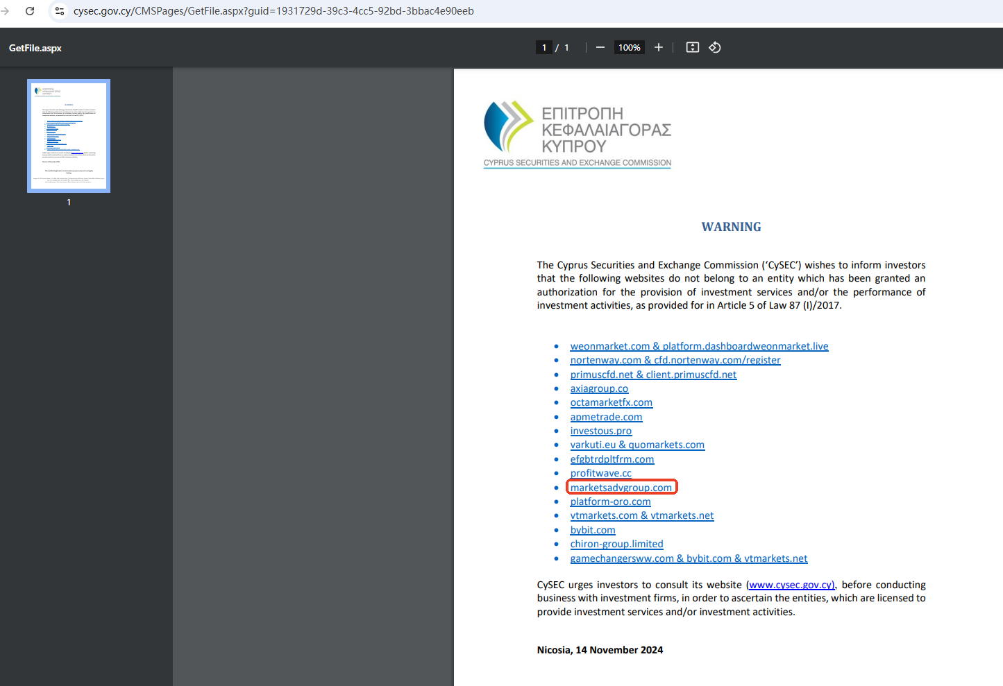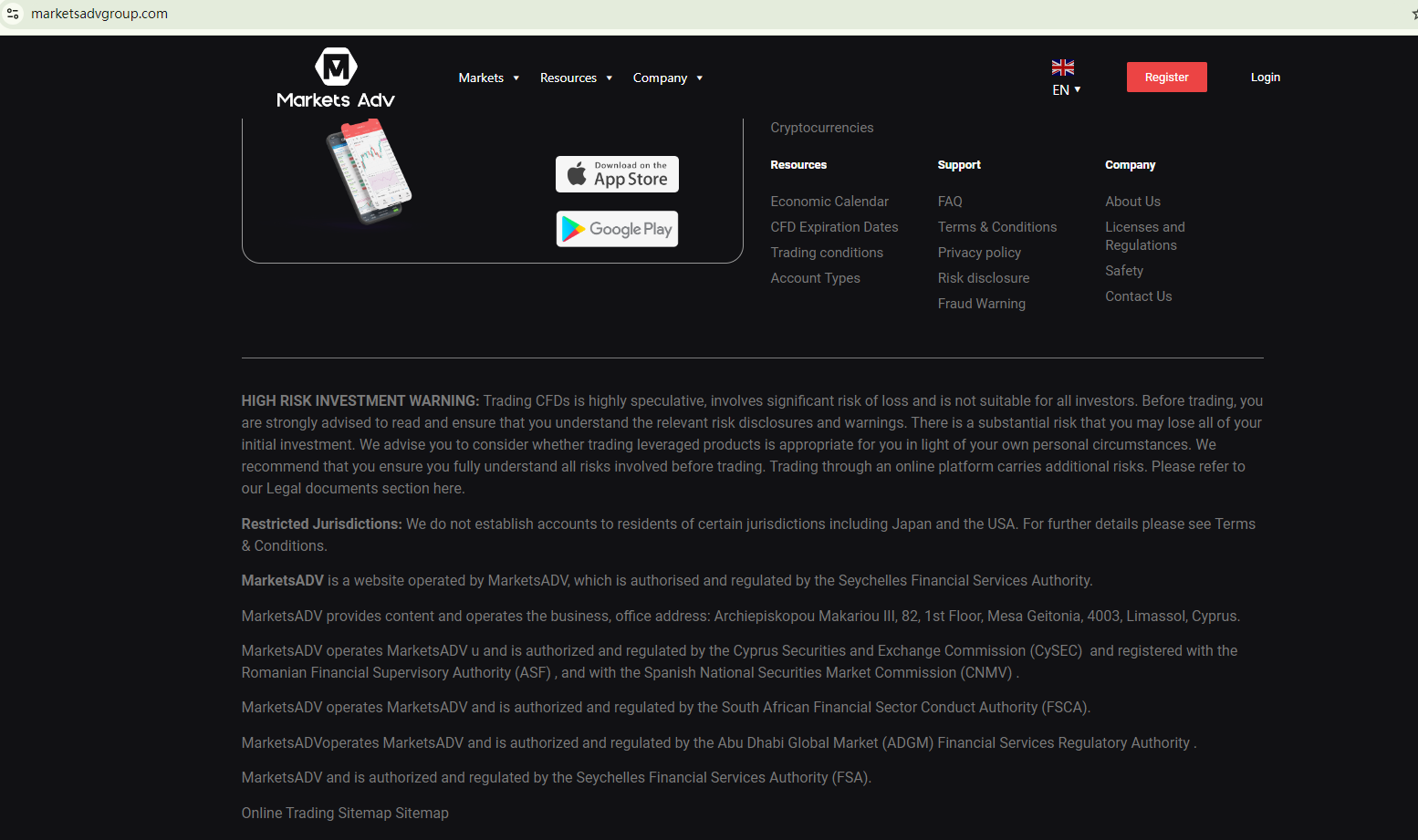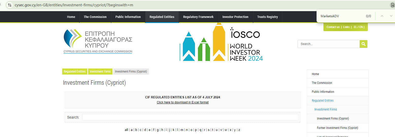 On 14 November 2024, the Cyprus Securities and Exchange Commission (CySEC) issued a warning against MarketsADV, believing this company might be providing financial services or products without authorisation. You may visit: https://www.cysec.gov.cy/CMSPages/GetFile.aspx?guid=1931729d-39c3-4cc5-92bd-3bbac4e90eeb.