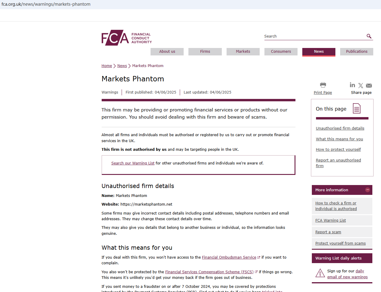 On Jun 4, 2025, the Financial Conduct Authority (FCA) issued a warning against Markets Phantom, believing this company might be providing financial services or products without proper authorization in the UK. https://www.fca.org.uk/news/warnings/markets-phantom
